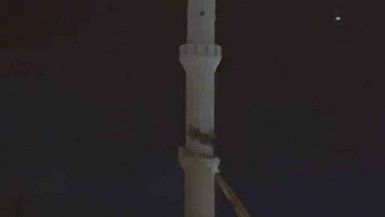 Elazığ'da depremde hasar alan cami minaresi, kontrollü olarak yıkıldı.