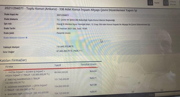 Elazığ ili Yemişlik Mah. 12 Etap, 336 Adet Konut İnşaatı ile Altyapı ve Çevre Düzenlemesi işine 8 firma teklif verdi. İhale, yüzde 24 kırım ve 99.999.00 TL bedelle Hatsa İnşaat + Güven İnşaat + Arsen İnşaat ortak girişim gurubunda kaldı.