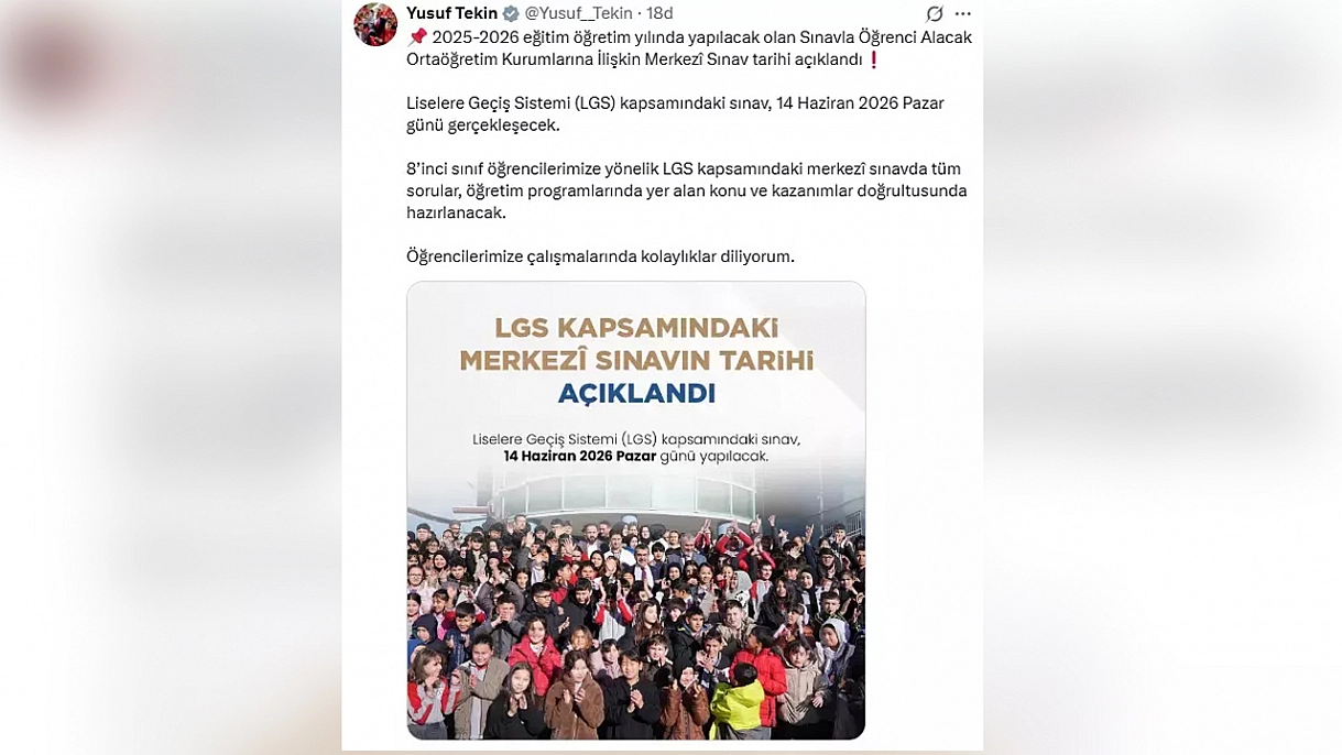 Gelişmeyi duyuran Milli Eğitim Bakanı Yusuf Tekin, sosyal medya hesabından yaptığı açıklamada, “8’inci sınıf öğrencilerimize yönelik LGS kapsamındaki merkezî sınavda tüm sorular, öğretim programlarında yer alan konu ve kazanımlar doğrultusunda hazırlanacak. Öğrencilerimize çalışmalarında kolaylıklar diliyorum.” ifadelerini kullandı.