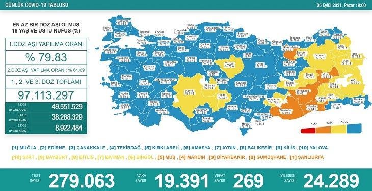 Bakan Koca sosyal medya hesabından yaptığı açıklamada: "Yeni vaka sayımız 19.391. Covid-19 sebebiyle bugünkü can kaybımız 269. Okullar yarın açılıyor. Yedi yaşındaki çocuklarımız sınıflarında maskeli olacak. Hepimize büyük sorumluluk düşüyor. Nihai çözüm, aşı! Aşılarımızı hemen yaptıralım. Tedbirlerde ÇOCUKLARIMIZ KADAR HASSAS olalım" dedi.
