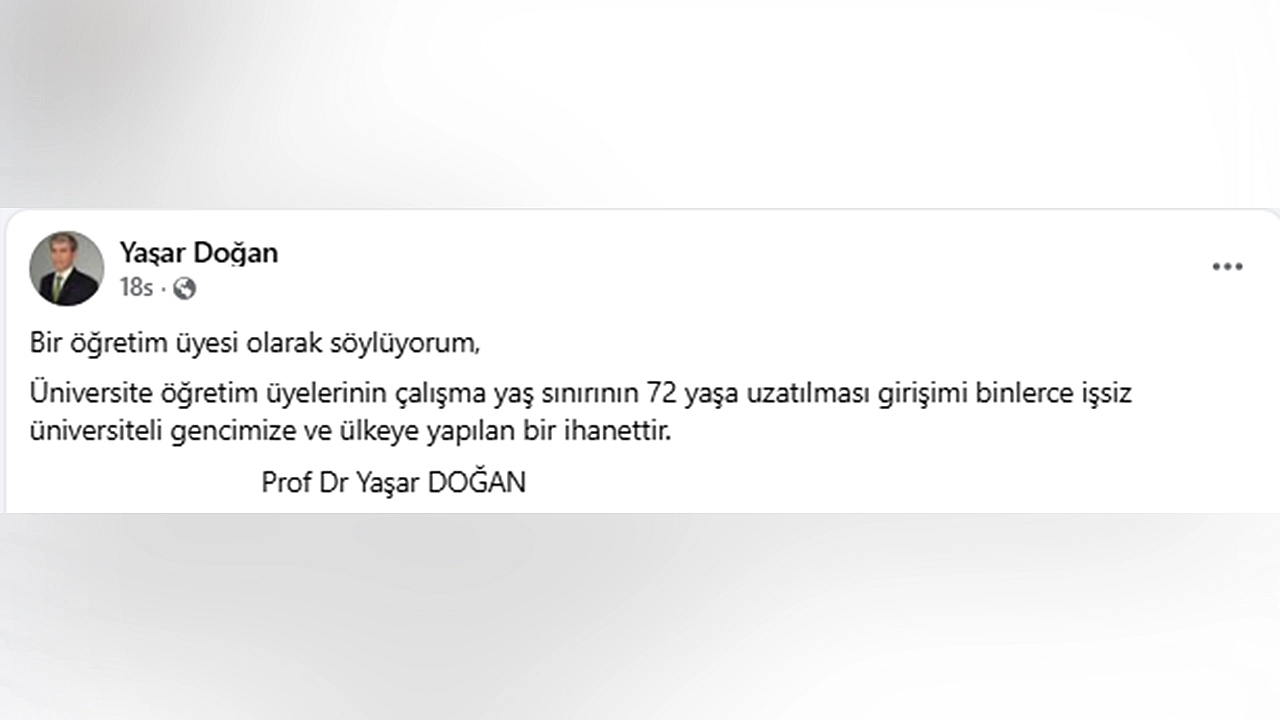 Sosyal medya hesabından da konuyla ilgili düşüncelerini paylaşan Prof. Dr. Doğan, “Bir öğretim üyesi olarak söylüyorum, Üniversite öğretim üyelerinin çalışma yaş sınırının 72 yaşa uzatılması girişimi binlerce işsiz üniversiteli gencimize ve ülkeye yapılan bir ihanettir.”