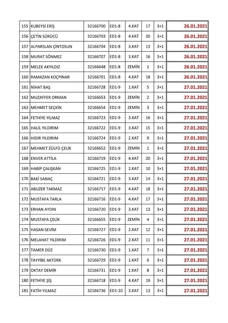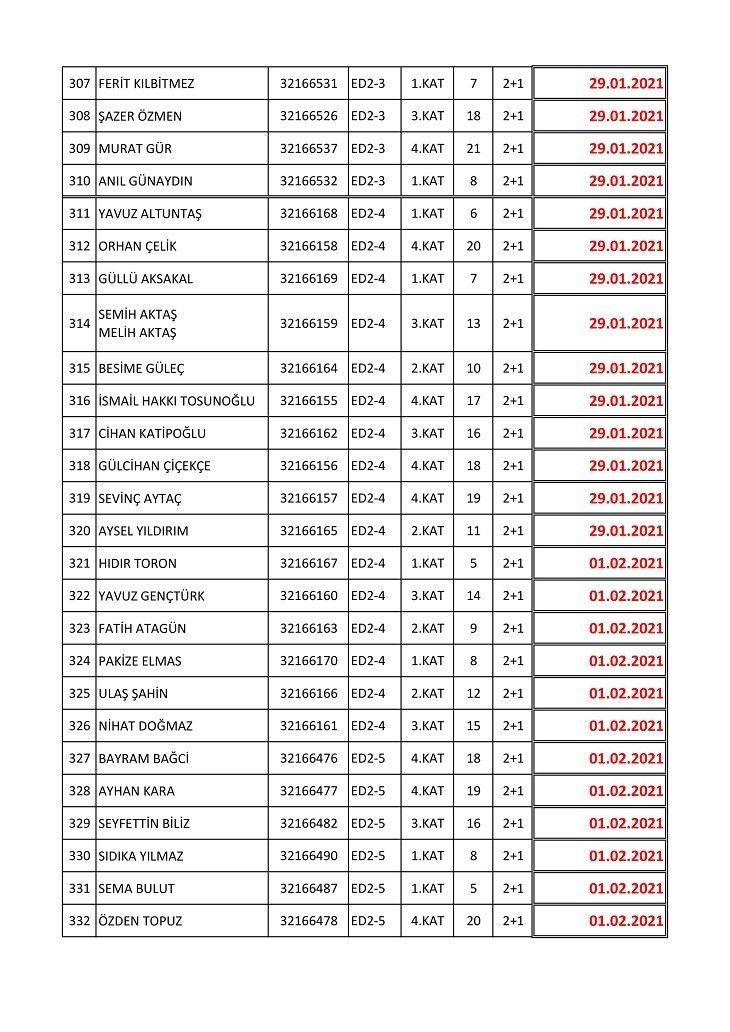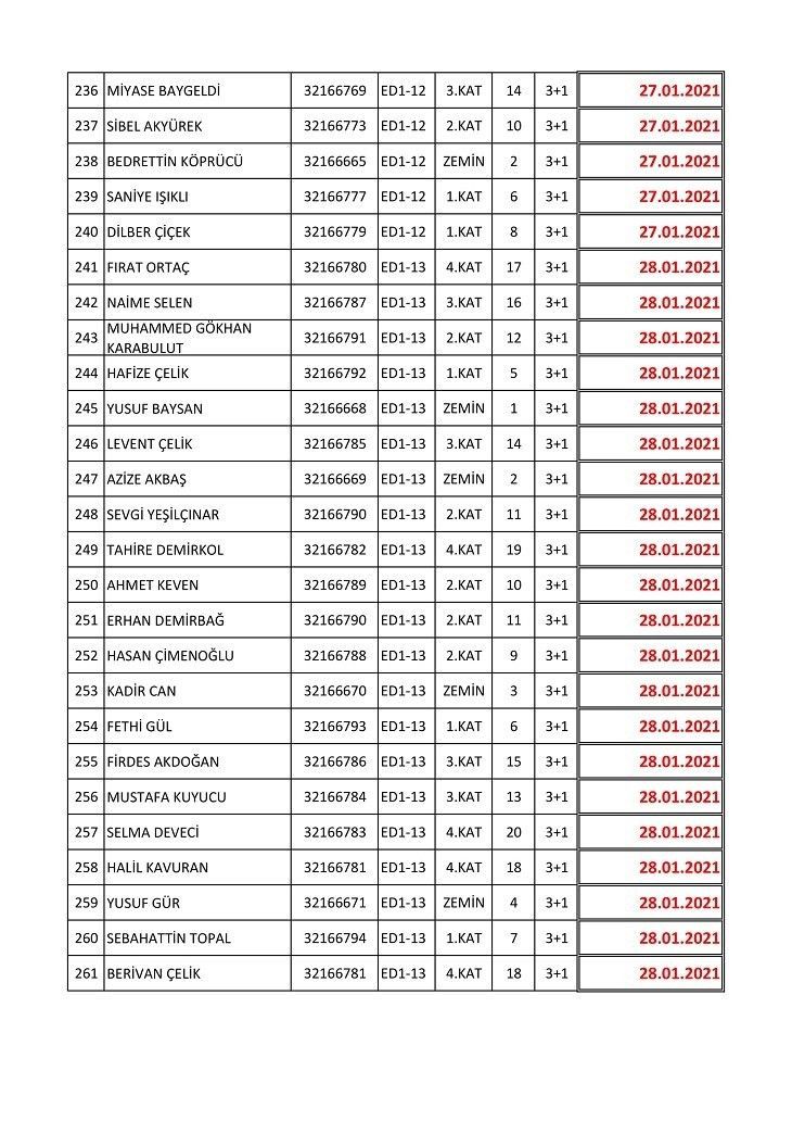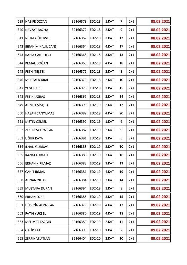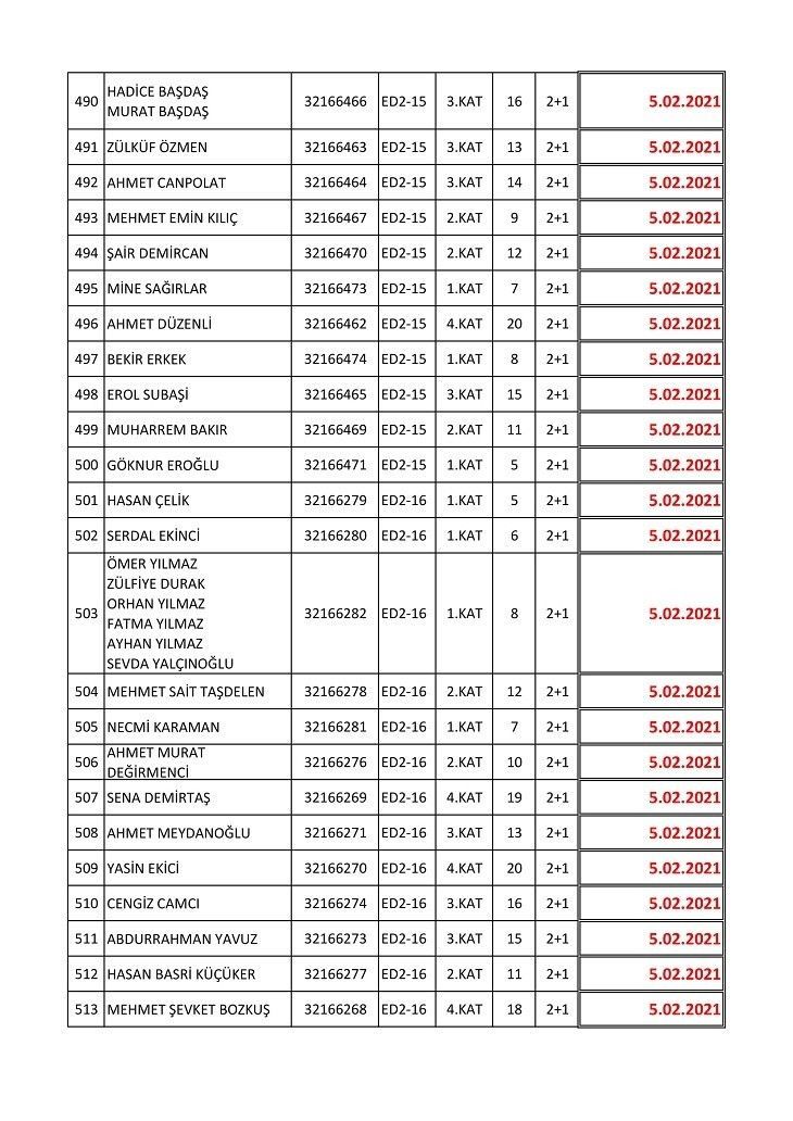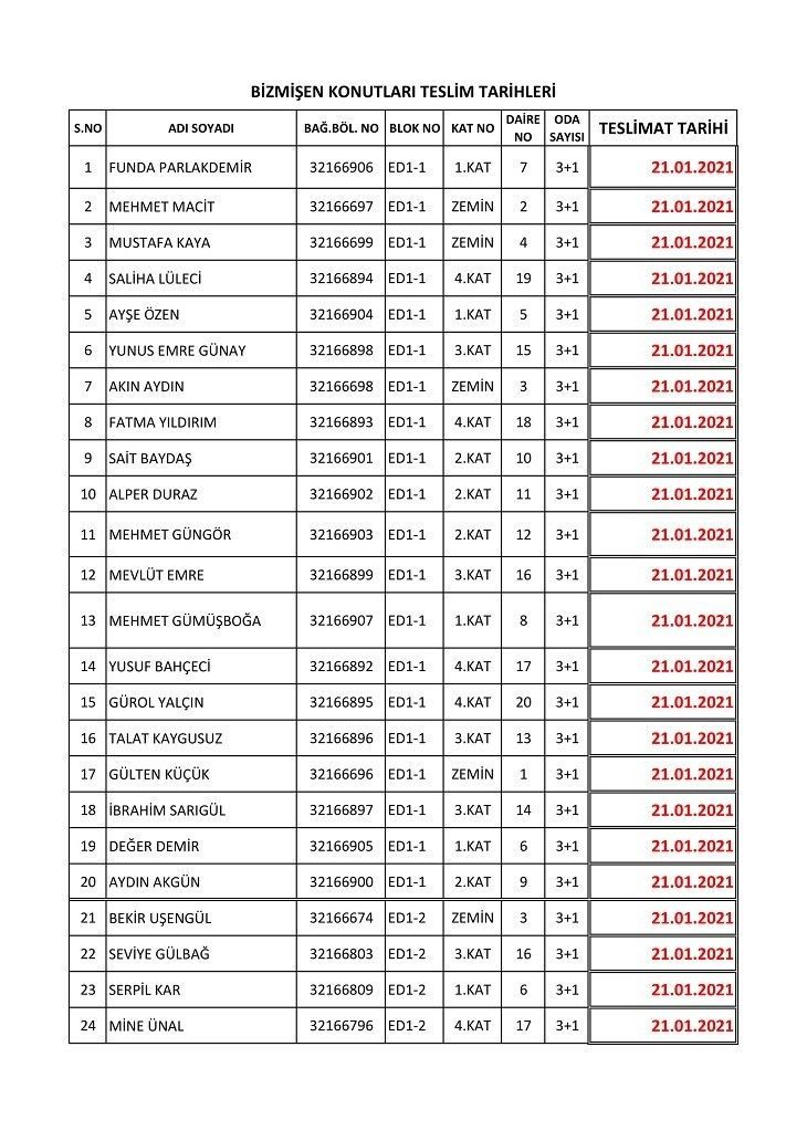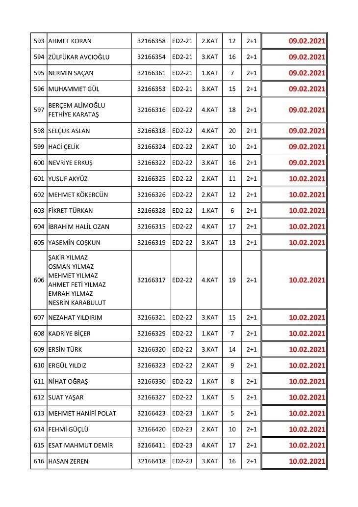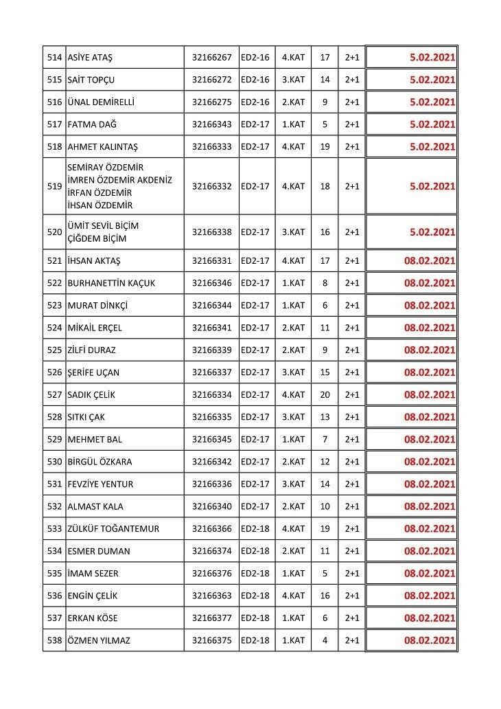 İşte isim listesine göre konutların teslim edileceği tarihler: