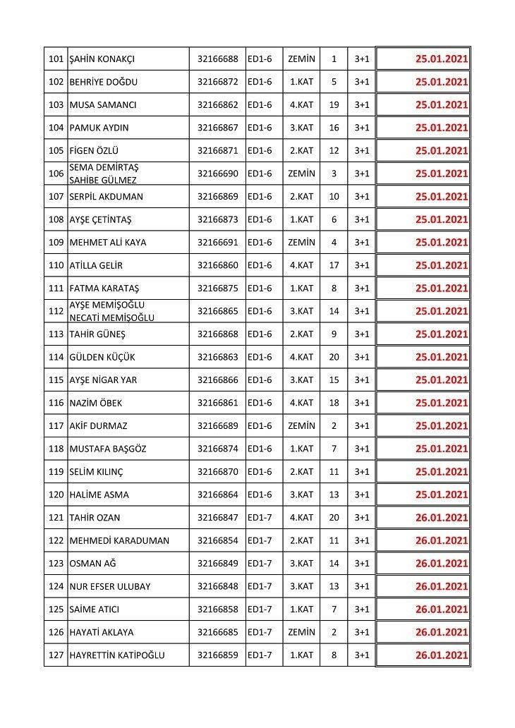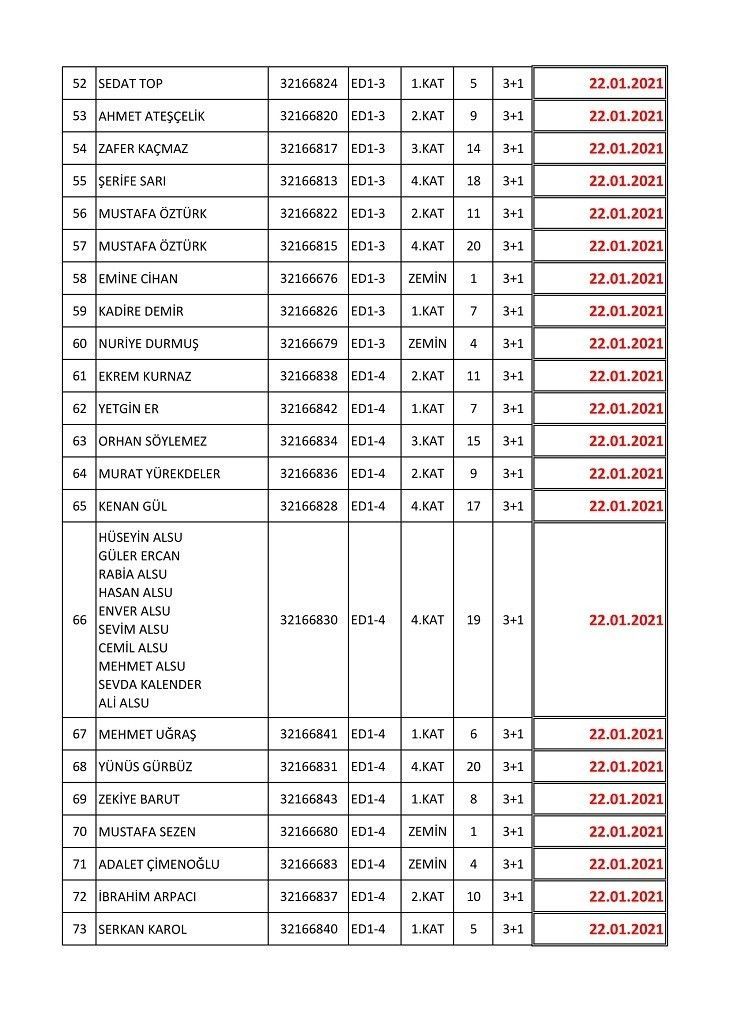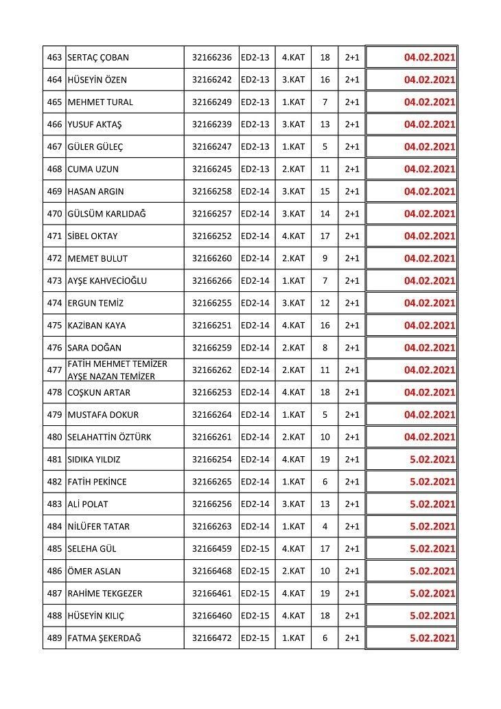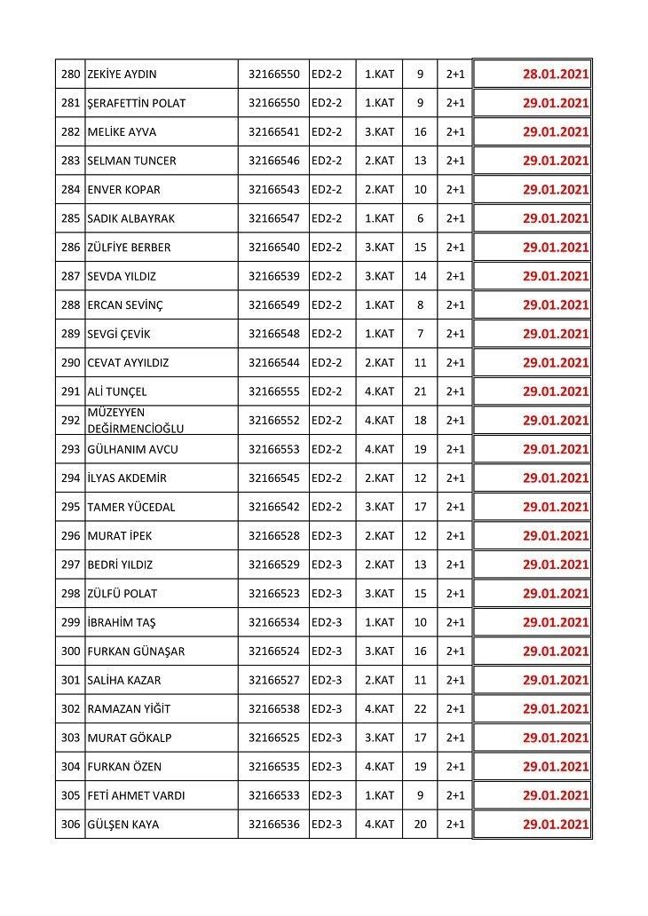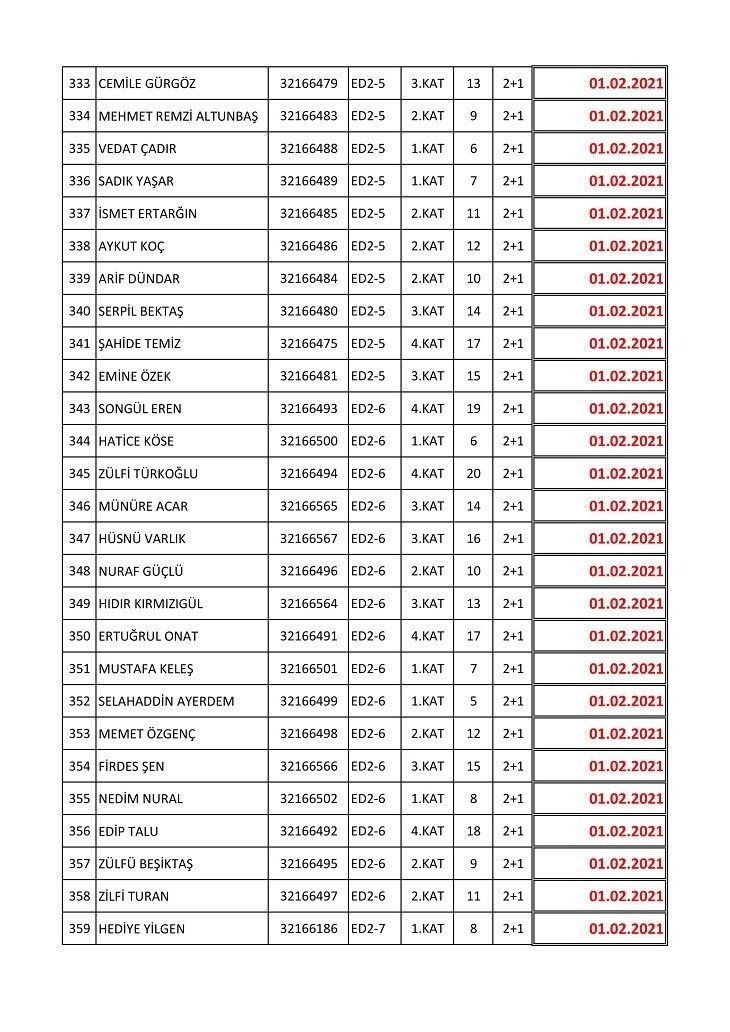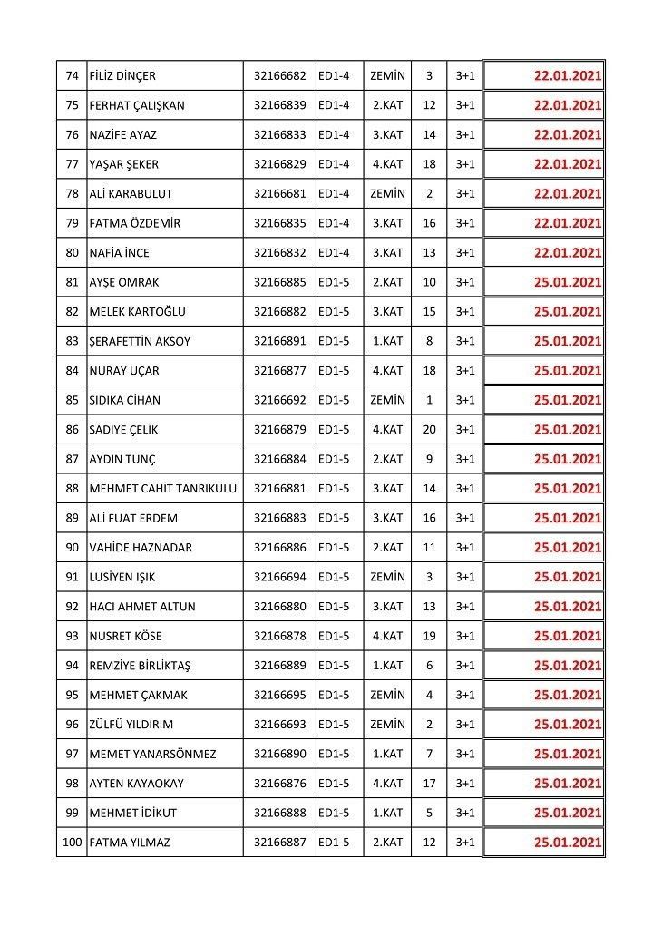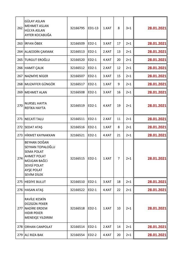 İşte isim listesine göre konutların teslim edileceği tarihler:
