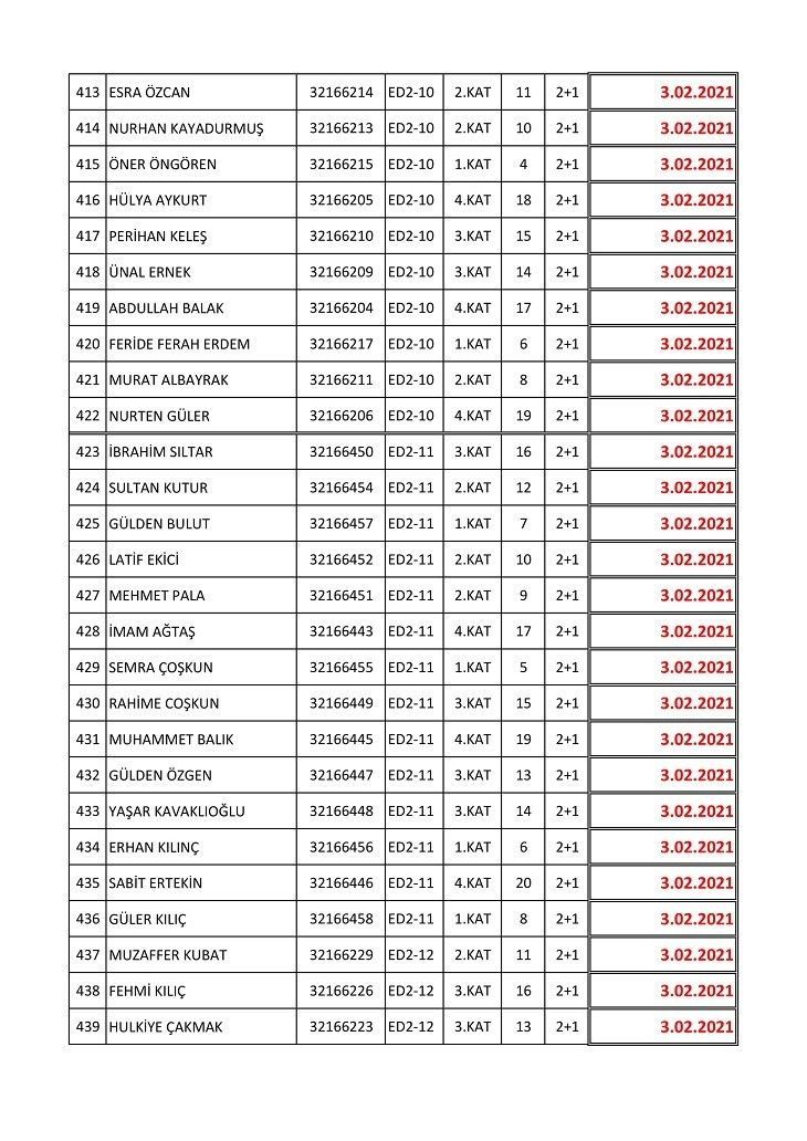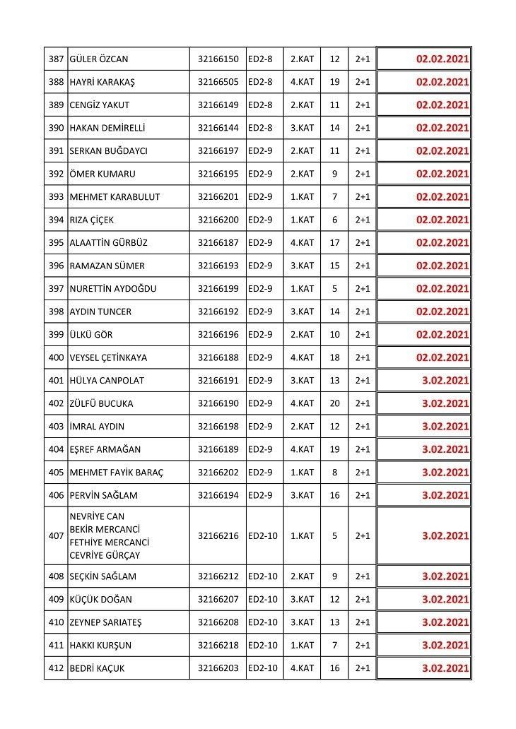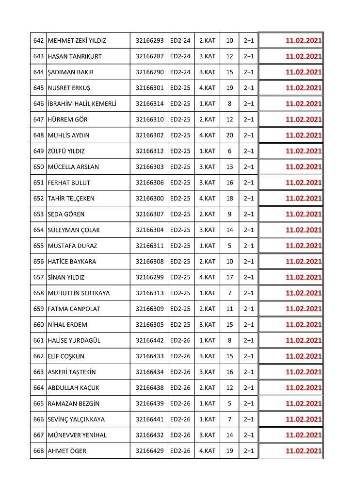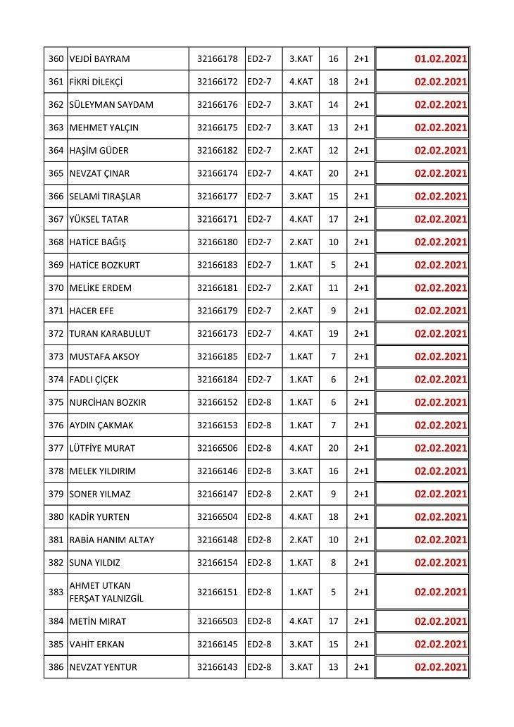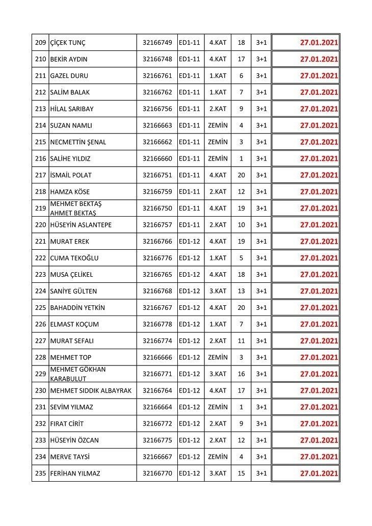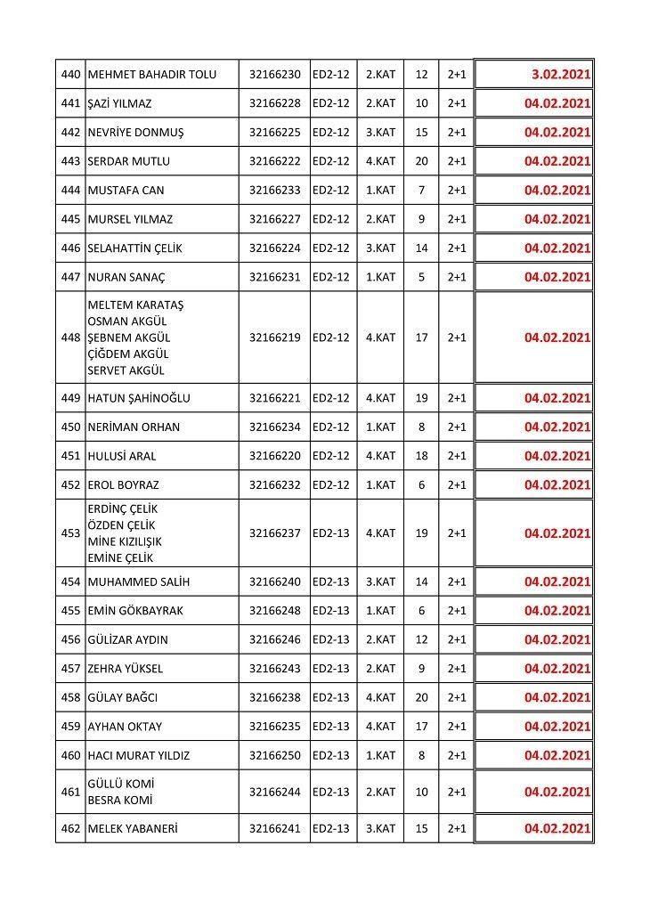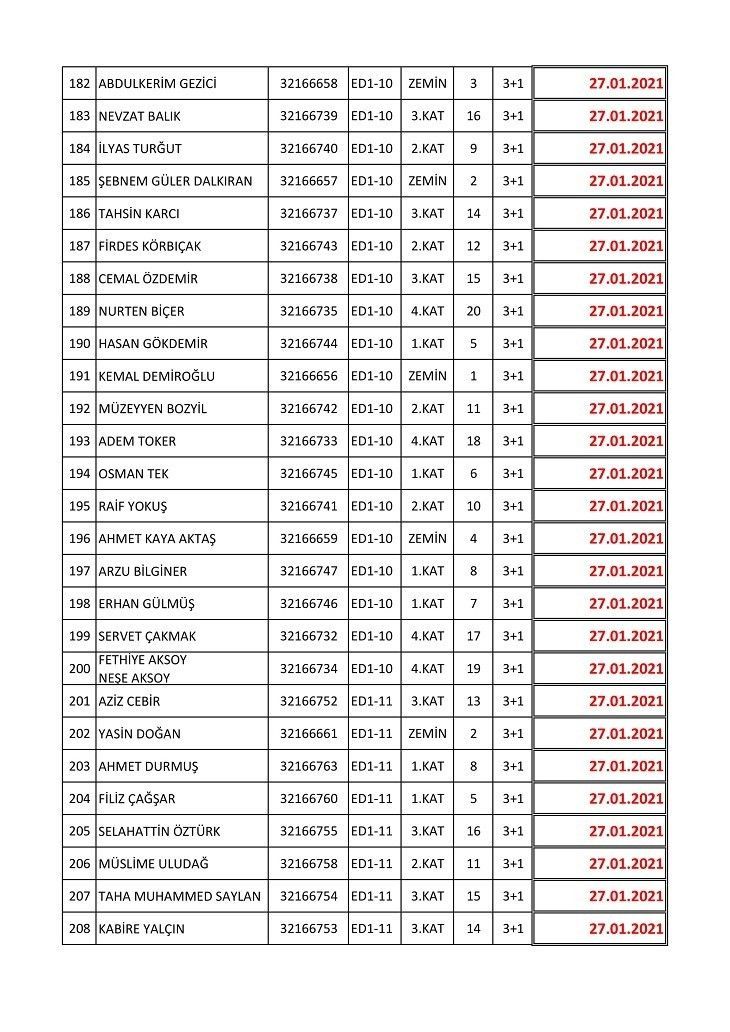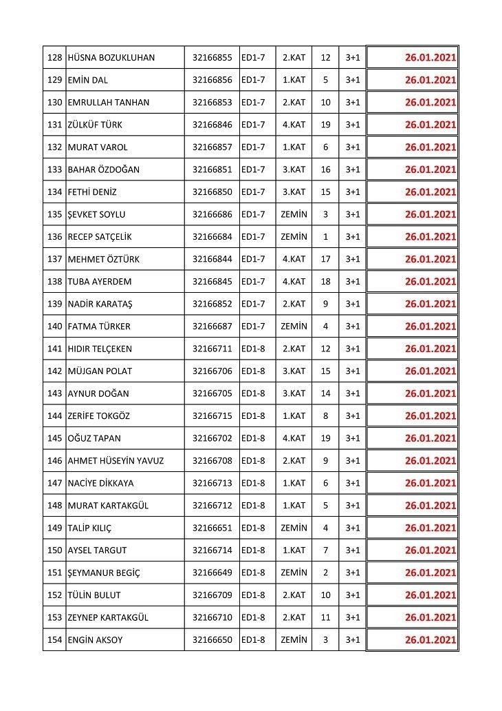 İşte isim listesine göre konutların teslim edileceği tarihler: