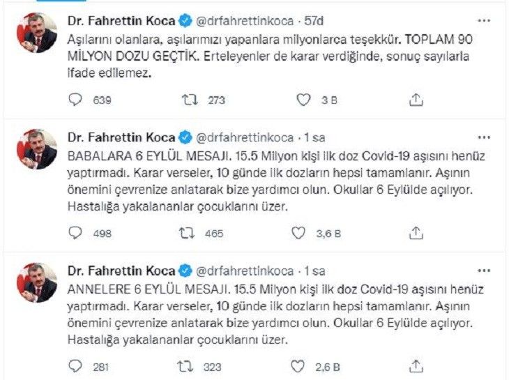 Sağlık Bakanı Fahrettin Koca "Annelere 6 Eylül mesajı" "Babalara 6 Eylül mesajı" başlığıyla aşı çağrısı yaptı.