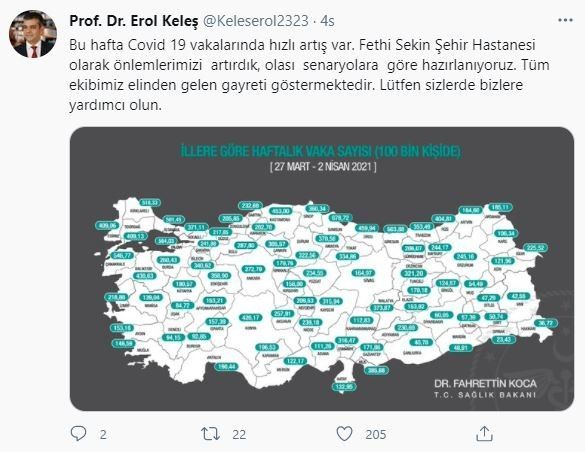 Fethi Sekin Şehir Hastanesi Başhekimi Prof. Dr. Erol Keleş sosyal medya hesabından yaptığı açıklamada vaka sayılarında hızlı artış olduğunu belirtti.