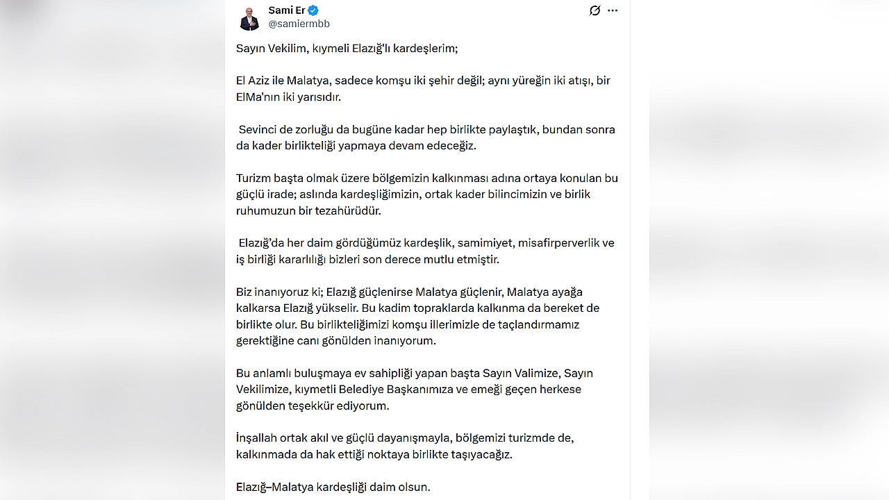 Malatya Büyükşehir Belediye Başkanı Sami Er, sosyal medya hesabından yaptığı paylaşımda Elazığ ile Malatya arasındaki kardeşliğe dikkat çekerek, bölgesel kalkınma ve turizmde ortak hareket mesajı verdi.