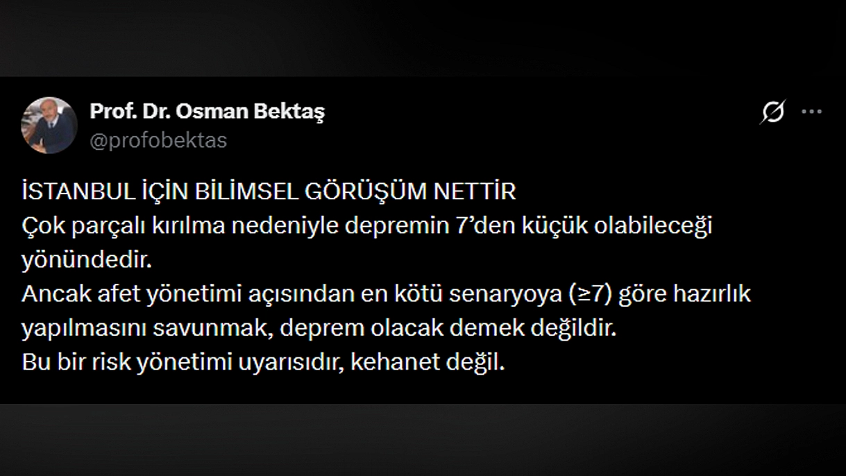 Prof. Dr. Osman Bektaş, İstanbul'da olası depremin 7 büyüklüğünün altında olabileceğini belirtti. Ancak afet yönetimi açısından hazırlıkların en kötü senaryoya göre yapılması gerektiğini vurguladı.