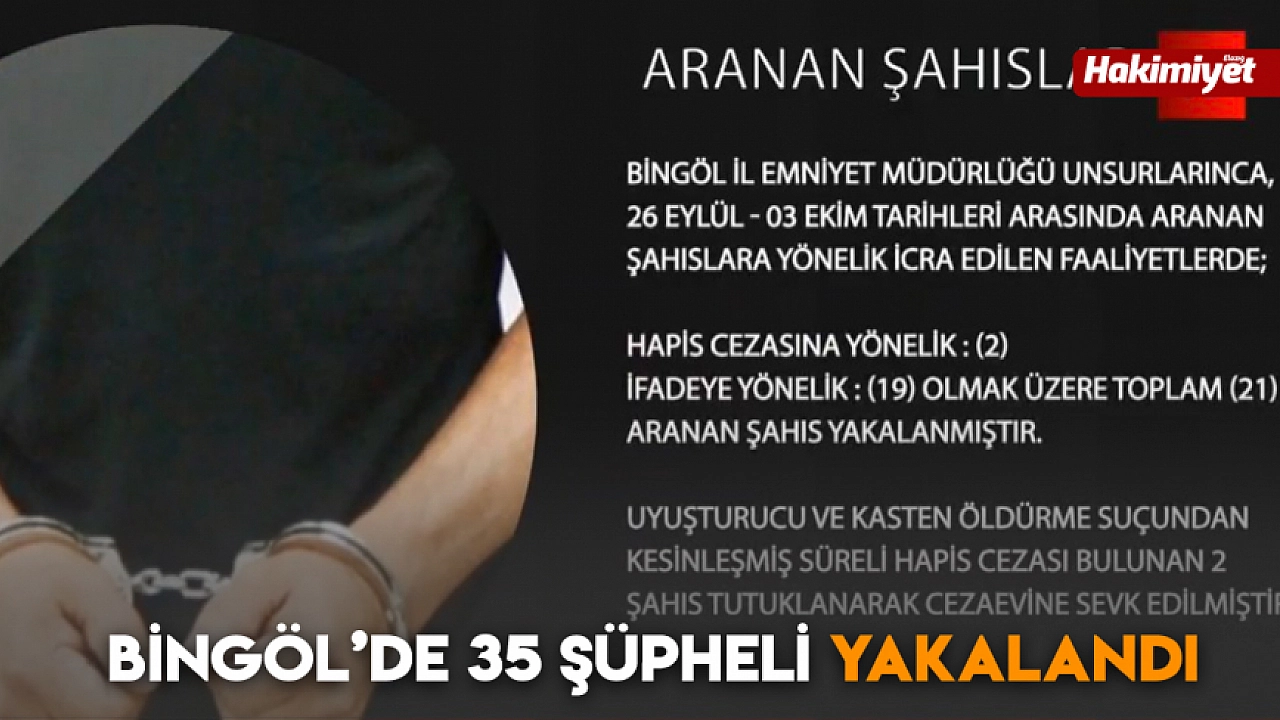 Bingöl Emniyet Müdürlüğü kent genelinde huzur ve güven için çalışmalarını aralıksız sürdürüyor. Bu çerçevede 26 Eylül-3 Ekim 2025 tarihleri arasında TEM,KOM, Narkotik ve Asayiş Şube Müdürlükleri tarafından icra edilen faaliyetler neticesinde farklı nitelikte ve sayıda suç unsuru materyal ele geçirildi. Çalışmalarda 35 şüphelinin yakalandığı ve şüphelinin tutuklandığı bildirildi.