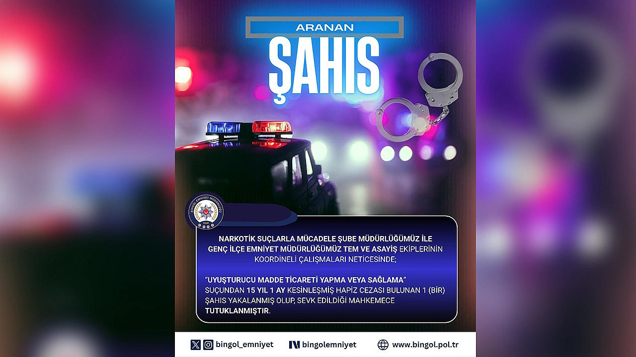 Bingöl İl Emniyet Müdürlüğü, aranan şahısların yakalanması çalışmalarını aralıksız sürdürüyor. Bu kapsamda Narkotik Suçlarla Mücadele Şube Müdürlüğü ile Genç İlçe Emniyet Müdürlüğü ekiplerinin koordineli çalışması sonucunda, 'Uyuşturucu Madde Ticareti Yapmak ve Sağlamak' suçundan hakkında 15 yıl 1 ay kesinleşmiş hapis cezası bulunan şüpheli gözaltına alındı. Emniyetteki işlemlerinin ardından adli makamlara sevk edilen zanlı, çıkarıldığı mahkemece tutuklanarak cezaevine gönderildi.