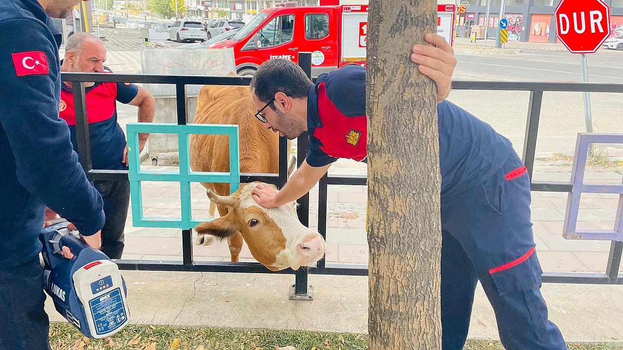 Olay, Kültür Mahallesi Bingöl Caddesi üzerindeki bir parkta meydana geldi. Sahipli olduğu öğrenilen inek, başını demir korkuluklara sıkıştırınca çevredeki vatandaşlar durumu itfaiyeye bildirdi.