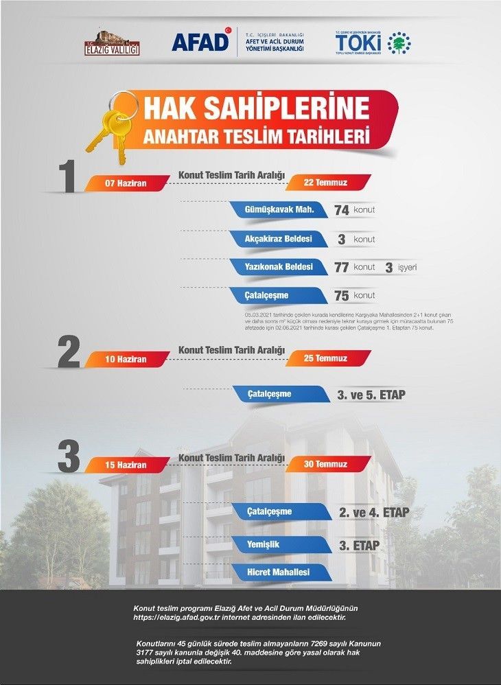 ura çekimleri sonucu adına Çatalçeşme 3. ve 5. Etap konutlarında çıkan hak sahibi aileler konutlarını 10.06.2021 – 25.07.2021 tarihleri arasında Çatalçeşme 3. Etapta B7 blokta ve 5. Etap Şantiye Ofisinde ekli teslim listesindeki tarihlere göre teslimleri yapılacaktır. Konut teslim programı Elazığ Afet ve Acil Durum Müdürlüğünün https://elazig.afad.gov.tr internet adresinden ilan edilecektir.