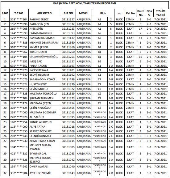 çekilen kurada kendilerine Karşıyaka Mahallesinde Konut çıkan listedeki 32 Hak sahiplerine