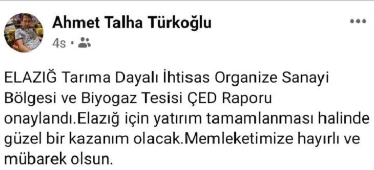 Elazığ merkeze bağlığı Cevizdere mevkiinde kurulacak Elazığ Tarıma Dayalı İhtisas Organize Sanayi Bölgesi ve Biyogaz Tesislerinin ÇED raporu onaylandı.