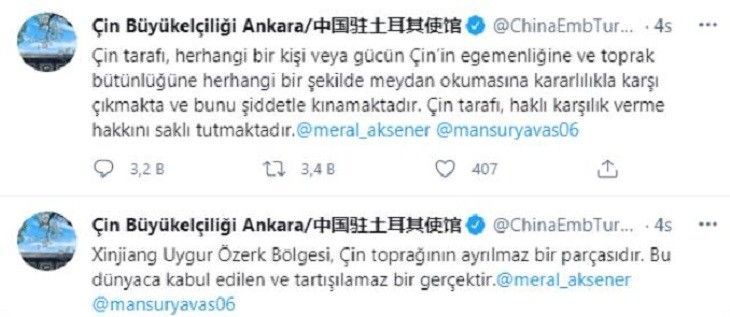 Çin Halk Cumhuriyeti Ankara Büyükelçiliği, yaptığı açıklamayla Meral Akşener ve Mansur Yavaş'a yanıt vermişti. Twitter'dan yapılan açıklamada, Akşener ve Yavaş'ın sosyal medya hesapları etiketlenerek, "Xinjiang Uygur Özerk Bölgesi, Çin toprağının ayrılmaz bir parçasıdır. Bu dünyaca kabul edilen ve tartışılamaz bir gerçektir. Çin tarafı, herhangi bir kişi veya gücün Çin'in egemenliğine ve toprak bütünlüğüne herhangi bir şekilde meydan okumasına kararlılıkla karşı çıkmakta ve bunu şiddetle kınamaktadır. Çin tarafı, haklı karşılık verme hakkını saklı tutmaktadır" ifadeleri kullanılmıştı.