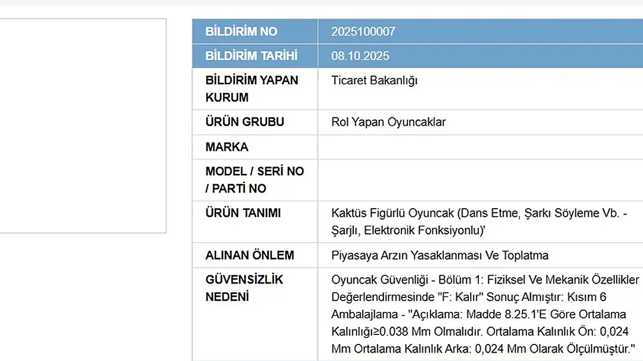 Bakanlığın yaptığı son denetimlerde, çocuklar tarafından çok sevilen Kaktüs Figürlü Oyuncak (Dans Etme, Şarkı Söyleme vb. – Şarjlı, Elektronik Fonksiyonlu) için boğulma riski (dışarıdan akciğerlere doğru olan hava akışının mekanik şekilde engellenmesi) tespit edildi. Bunun üzerine, ürünün piyasadan toplatılmasına ve üretiminin yasaklanmasına karar verildi.
