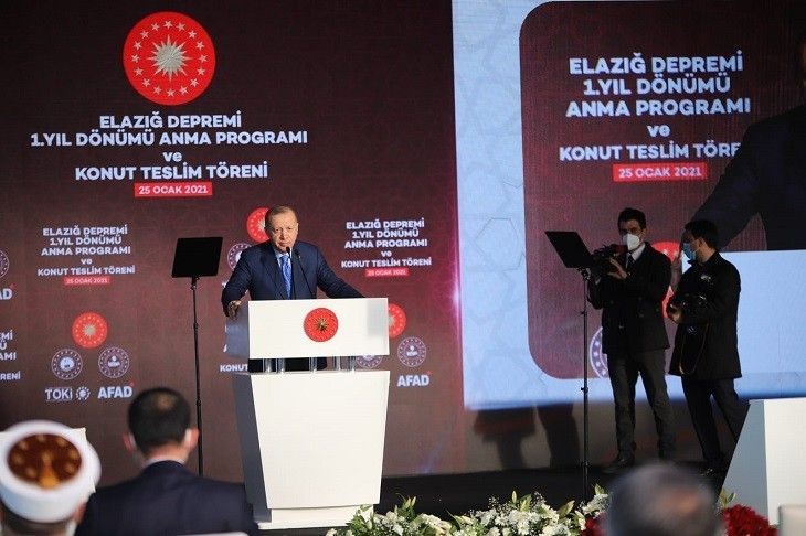 Elazığ’a gelen Cumhurbaşkanı Recep Tayyip Erdoğan, Elazığ depreminin 1. yıl dönümü nedeniyle düzenlenen anma ve deprem konutları anahtar teslim törenine katılmak üzere Elazığ’a geldi. Uçakla Elazığ Havalimanına gelen Cumhurbaşkanı Erdoğan, Çevre ve Şehircilik Bakanı Murat Kurum’la helikoptere geçerek, kentte yapılan çalışmaları yaklaşık yarım saat havadan inceledi. Erdoğan ardından merkeze bağlı Yazıkonak beldesinde deprem konutları teslim töreni alanına geçti. Cumhurbaşkanı Erdoğan, burada bekleyen vatandaşlara otobüs üzerinden açıklamada bulundu.