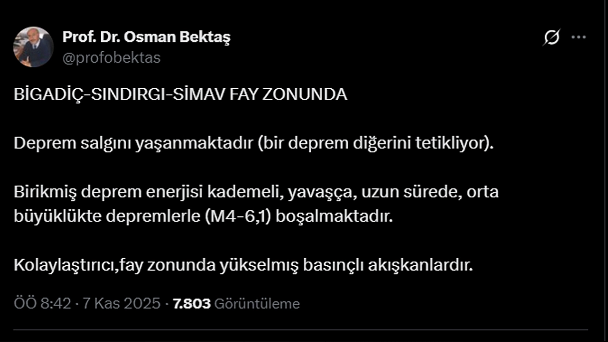 Haberler Yaşam Deprem uzmanı Bektaş: O fay hattına dikkat çekti! Deprem uzmanı Bektaş: O fay hattına dikkat çekti! Deprem uzmanı Prof. Dr. Osman Bektaş, Balıkesir'de meydana gelen depremlere ilişkin açıklamalarda bulundu. PAYLAŞ 07.11.2025 12:04 Güncelleme: 07.11.2025 12:09 Ayşe ORZANMuhabir TAKİP ET 8 9 PAYLAŞ Prof. Dr. Bektaş'ın bu açıklamasına, iç serinleten bir yorum geldi.