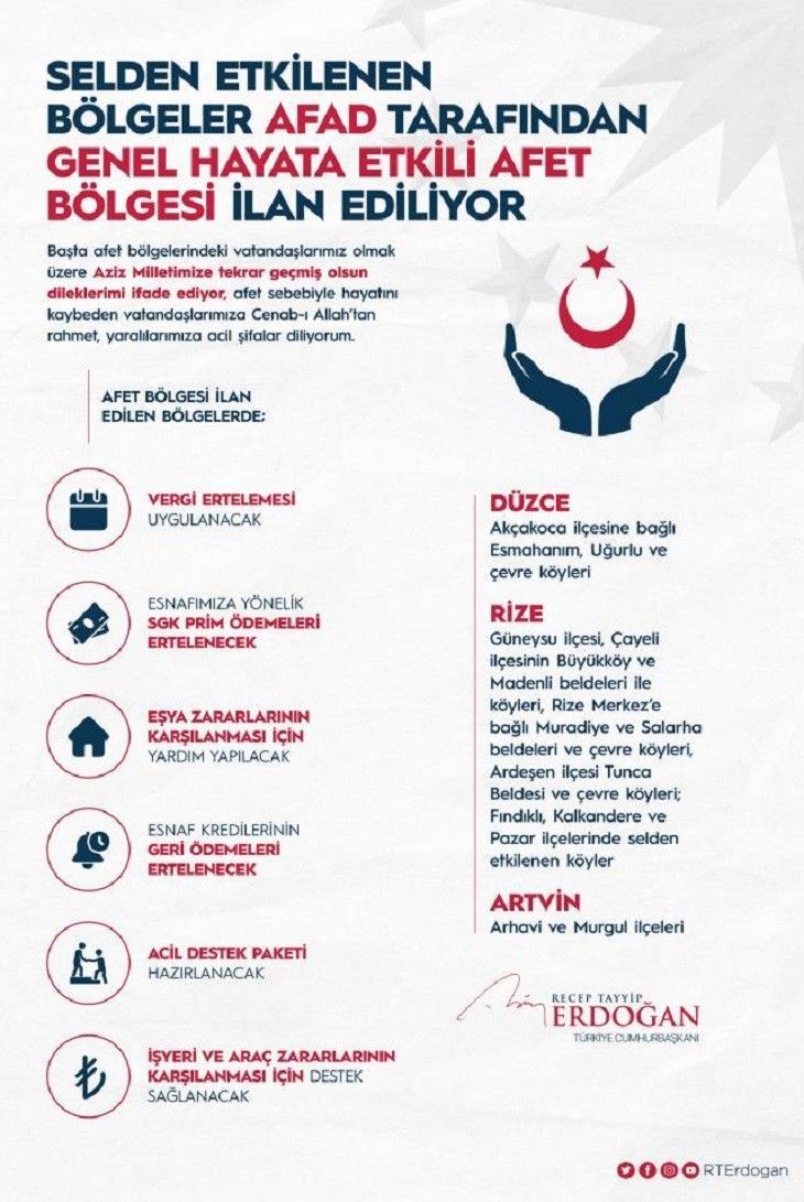 Sosyal medya hesabından paylaşım yapan Cumhurbaşkanı Erdoğan, selden etkilenen bölgelerin AFAD tarafından "Genel Hayata Etkili Afet Bölgesi" ilan edildiğini duyurdu. Erdoğan paylaşımında şu ifadelere yer verdi: