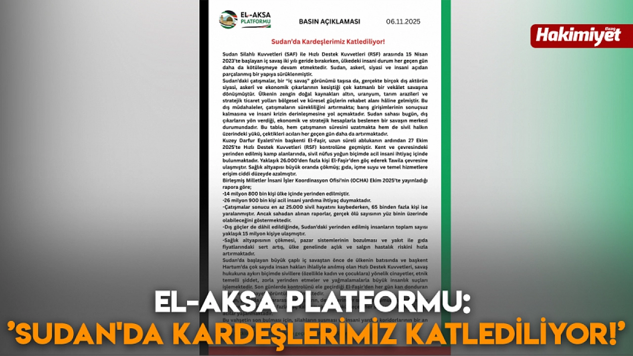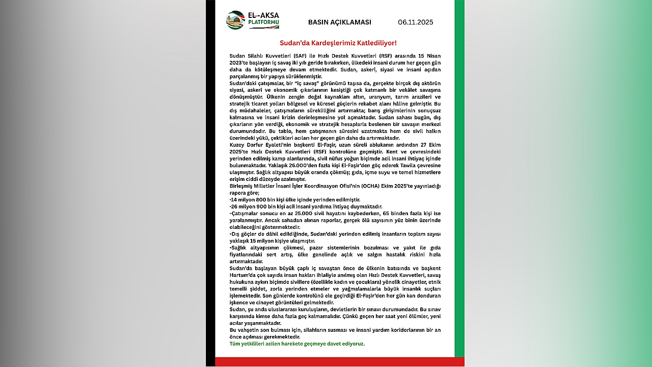 Elazığ El- Aksa platformu tarafından yayınlanan bildiride : Sudan Silahlı Kuvvetleri (SAF) ile Hızlı Destek Kuvvetleri (RSF) arasında 15 Nisan 2023'te başlayan iç savaş iki yılı geride bırakırken, ülkedeki insani durum her geçen gün daha da kötüleşmeye devam etmektedir. Sudan, askerî, siyasi ve insani açıdan parçalanmış bir yapıya sürüklenmiştir.