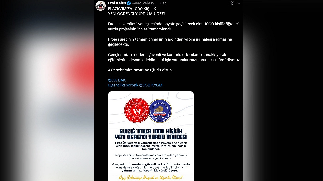 Milletvekili Keleş, "Fırat Üniversitesi yerleşkesinde hayata geçirilecek olan 1000 kişilik öğrenci yurdu projesinin ihalesi tamamlandı.