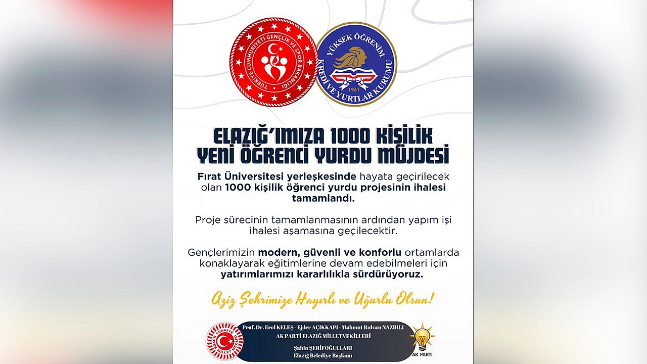 Elazığ AK Parti Milletvekili Erol Keleş, Fırat Üniversitesi yerleşkesinde hayata geçirilecek olan 1000 kişilik öğrenci yurdu projesinin ihale sürecinin tamamlandığını duyurdu.