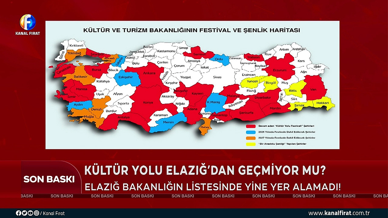 Kültür ve Turizm Bakanı Mehmet Nuri Ersoy’un açıkladığı “Kültür Yolu Festivali” programında 2026 ve 2027 yıllarında festivale dahil edilecek iller arasında Elazığ yine yer almadı. Festival programında yer alma hayali kuran Elazığ’ın en az 2 yıl daha festival programında yer alamayacağı Kanal Fırat canlı yayınında ortaya çıktı.