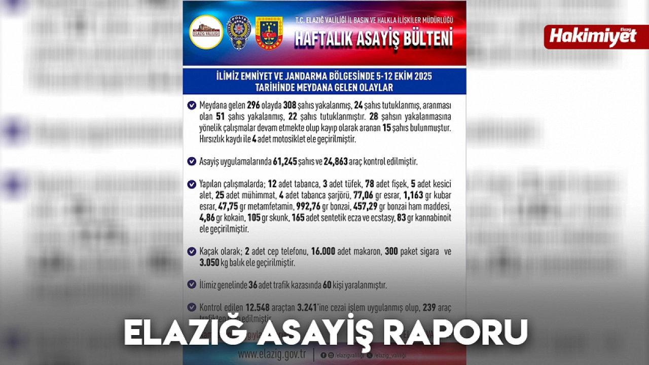 Elazığ Valiliği, 5-12 Ekim 2025 tarihleri arasındaki haftalık asayiş verilerini açıkladı. Kent genelinde meydana gelen 296 olayda 308 kişi yakalanırken, 24 kişi tutuklandı. Çalışmalarda 61 bin 245 şahıs ve 24 bin 863 araç denetlendi. Kontrol edilen araçlardan, 3 bin 241’ine cezai işlem uygulanırken 239 araç da trafikten men edildi.