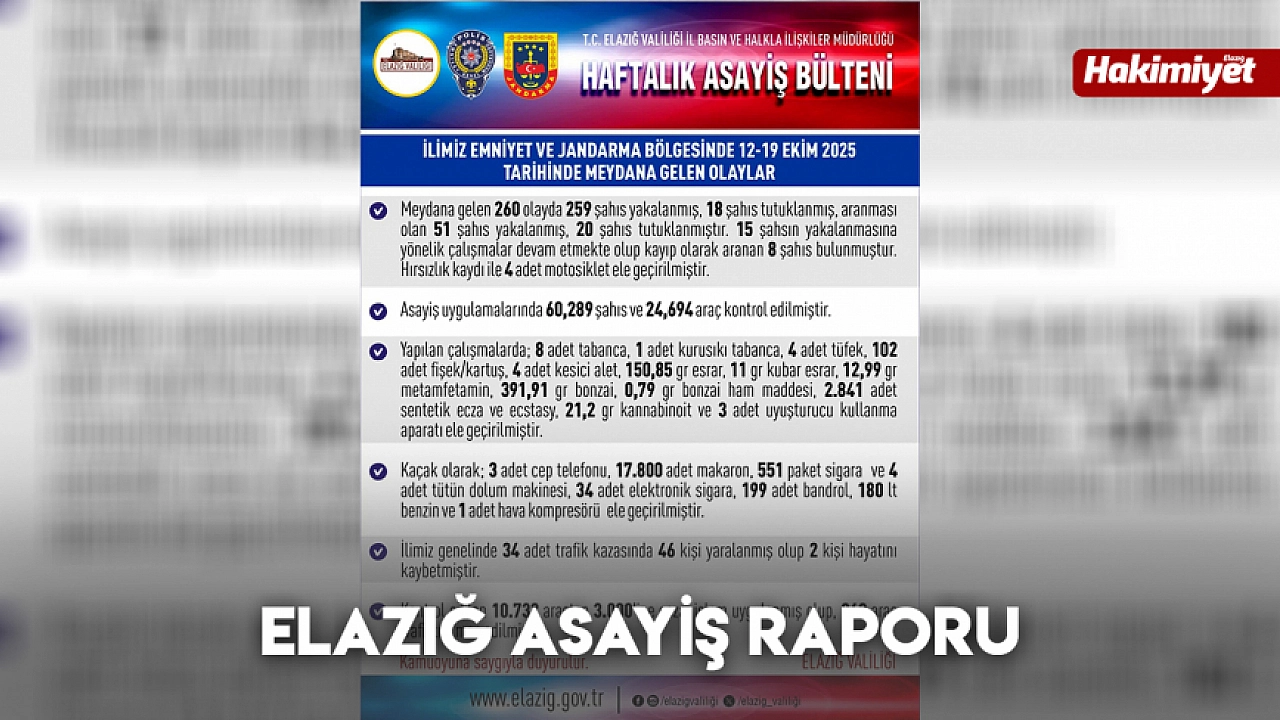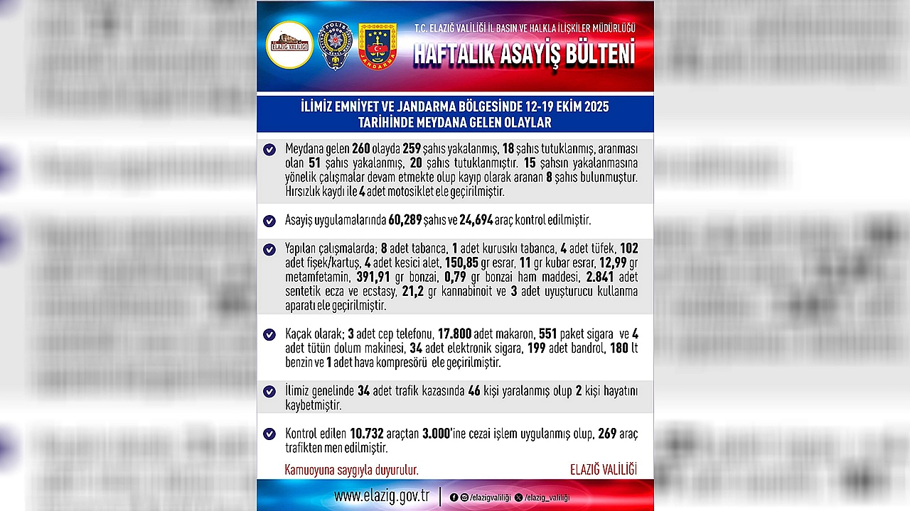 Elazığ Valiliği, 12-19 Ekim 2025 tarihleri arasındaki haftalık asayiş verilerini açıkladı. Kent genelinde meydana gelen 260 olayda 259 kişi yakalanırken, 18 kişi tutuklandı. Aranması olan 51 şahısta yakalanırken 20’si tutuklandı. Çalışmalarda 60 bin 289 şahıs ve 24 bin 694 araç denetlendi. Kontrol edilen araçlardan, 3 binine cezai işlem uygulanırken 269 araç da trafikten men edildi. Kent genelinde 34 adet trafik kazasında 46 kişinin yaralandığı ve 2 kişinin hayatını kaybettiği aktarıldı.