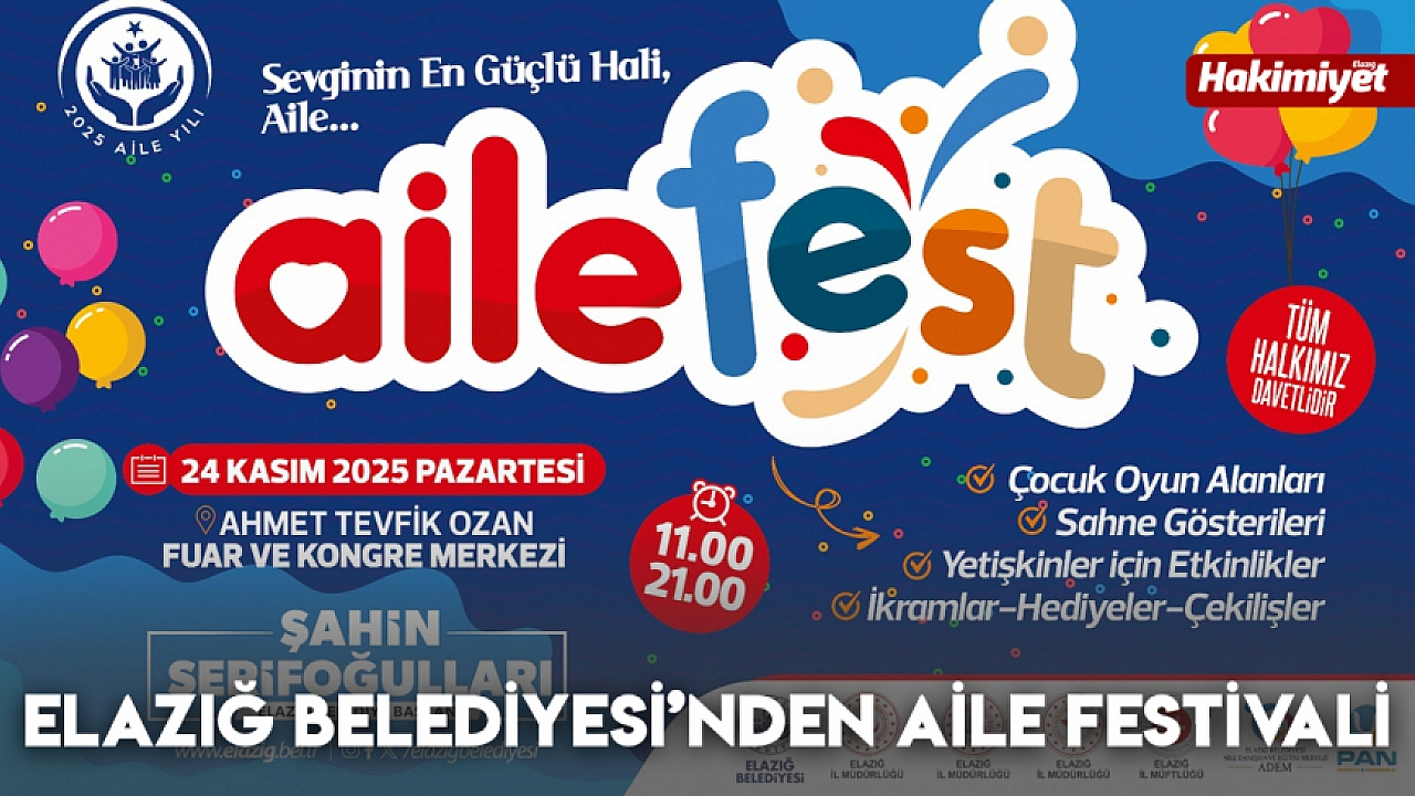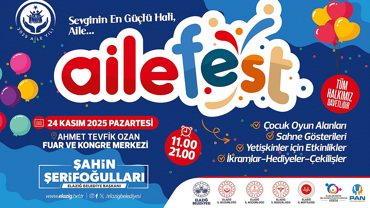 Elazığ Belediyesi Basın-Yayın ve Halkla İlişkiler Müdürlüğü’nden yapılan açıklamada, 2025 Aile Yılı kapsamında düzenlenecek AileFest’in, şehirde birlik, dayanışma ve aile olma kültürünü güçlendirecek özel bir buluşma olacağı belirtilerek, “24 Kasım Pazartesi günü, saat 11.00 – 21.00 arasında Ahmet Tevfik Ozan Fuar ve Kongre Merkezi’nde düzenleyeceğimiz AileFest etkinliğinde aile değerlerini güçlendirmeyi ve birlikte olmanın mutluluğunu geniş kitlelerle paylaşmayı hedefliyoruz.
