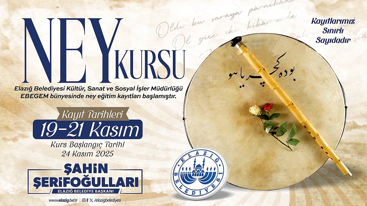 Elazığ Belediyesi tarafından ücretsiz olarak düzenlenecek ney kursuna katılmak isteyen vatandaşlar, 21 Kasım Cuma gününe kadar başvuruda bulunabilecek.