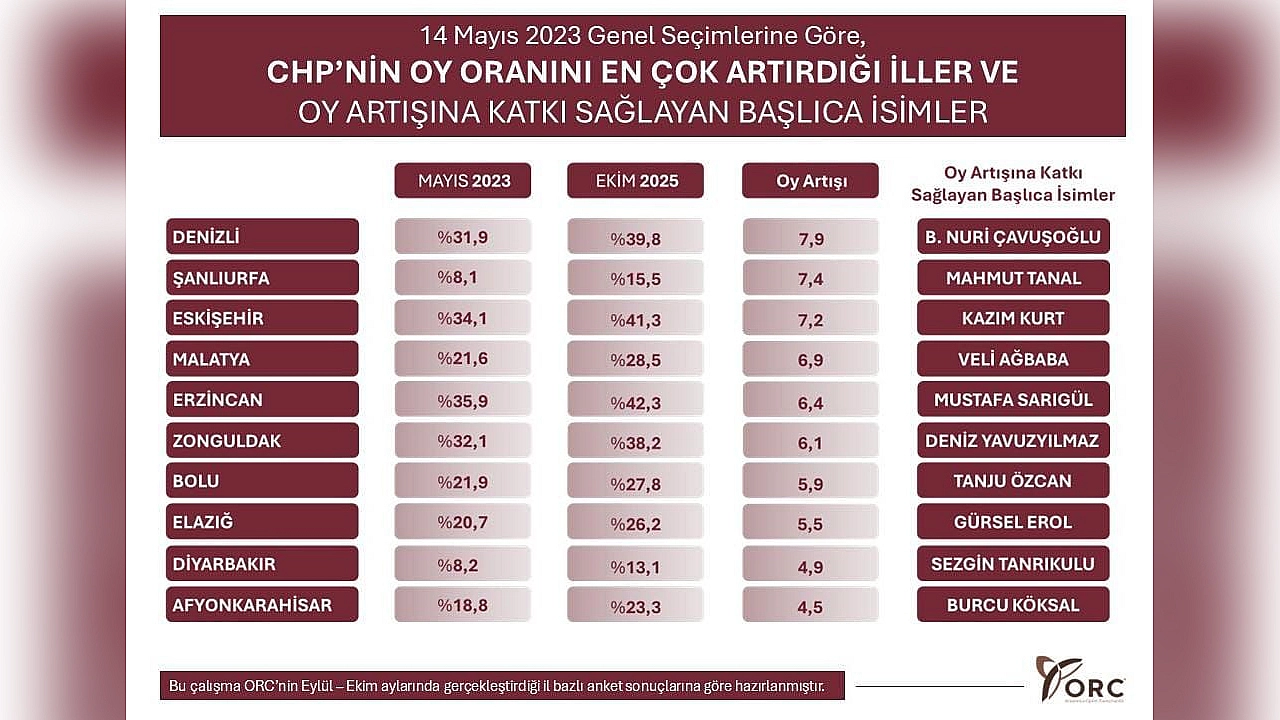 ORC Araştırma Şirketi'nin eylül–ekim aylarında gerçekleştirdiği il bazlı anket sonuçlarına göre, Cumhuriyet Halk Partisi'nin oy oranını en çok artırdığı iller arasında Elazığ da yer aldı.