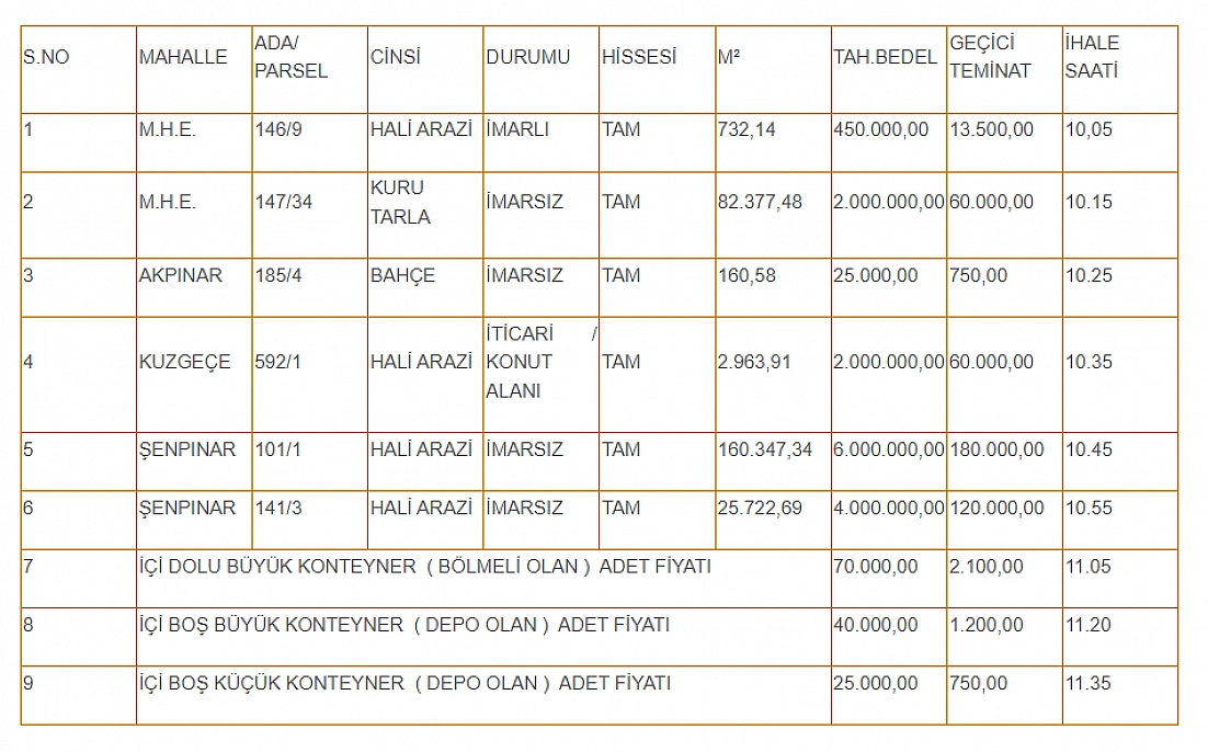 Elazığ'ın Ağın Belediyesi, mülkiyeti kendisine ait olan çeşitli taşınmazlar ile konteynerleri 2886 Sayılı Devlet İhale Kanunu'nun 45. maddesi uyarınca Açık Teklif Usulü ile satışa sunuyor. İhale, 1 Aralık 2025 Pazartesi günü saat 10.00'da, Belediye Encümeni huzurunda gerçekleştirilecek.