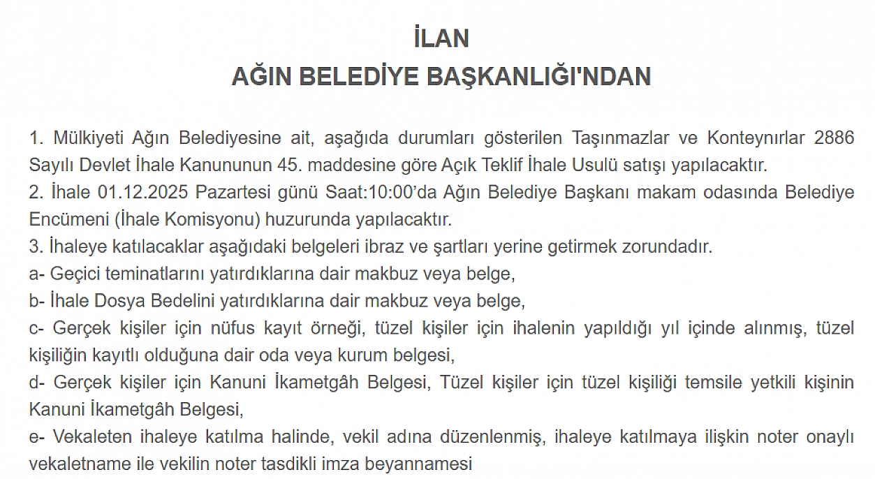 Elazığ'ın Ağın Belediyesi, mülkiyeti kendisine ait olan çeşitli taşınmazlar ile konteynerleri 2886 Sayılı Devlet İhale Kanunu'nun 45. maddesi uyarınca Açık Teklif Usulü ile satışa sunuyor. İhale, 1 Aralık 2025 Pazartesi günü saat 10.00'da, Belediye Encümeni huzurunda gerçekleştirilecek.