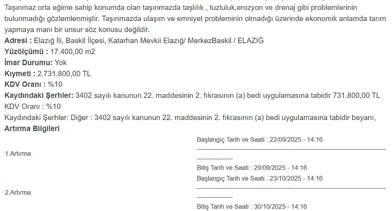 İhale kapsamında yüzde 10 KDV uygulanacak. Taşınmaz için ilk artırma 22 Eylül 2025 tarihinde başlayacak ve 29 Eylül 2025’te sona erecek. Eğer ilk satışta alıcı çıkmazsa ikinci artırma 30 Ekim 2025’te başlayacak.