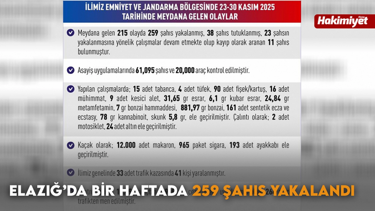 Elazığ Valiliği, 23-30 Kasım 2025 tarihleri arasındaki haftalık asayiş verilerini açıkladı. Kent genelinde meydana gelen 215 olayda 259 şüpheli yakalanırken, 38 kişi tutuklandı.