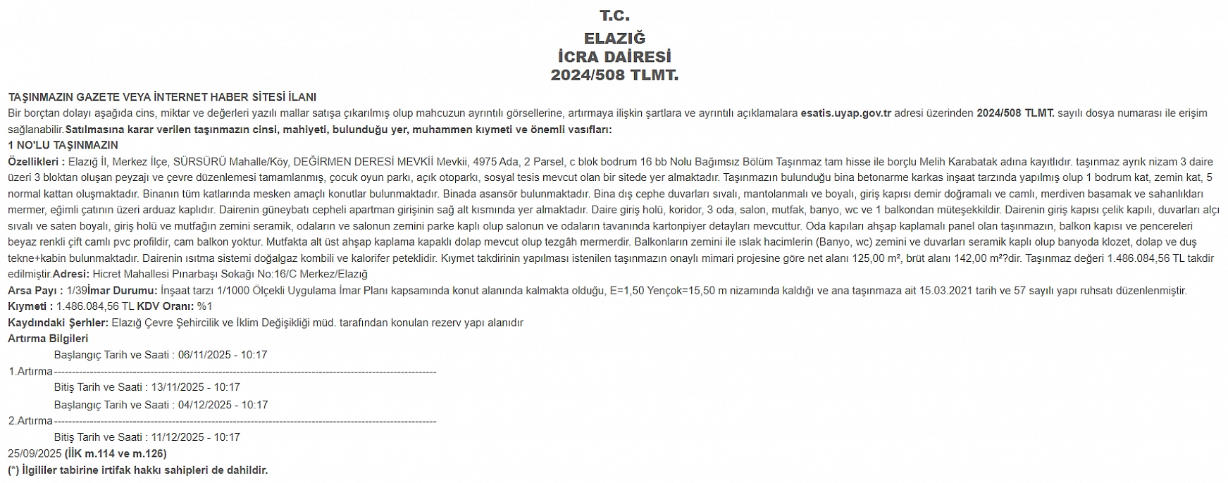 Elazığ'da Sürsürü Mahallesi'nde bulunan lüks daire icradan satışa çıkarıldı. Muhammen bedel 1 milyon 486 bin TL olarak açıklandı.