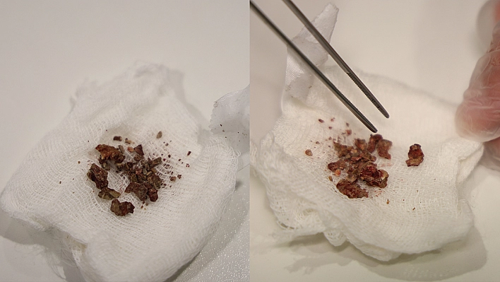 Hastanın burunda şekil bozukluğu şikayetiyle kendilerine başvurduğunu ifade eden Op. Dr. Demirbağ, " Gerekli tetkikleri yaptıktan sonra ameliyatımıza aldık. Ameliyat sırasında rutin işlemlerimizi gerçekleştirirken burun içinde normalde karşılaşmadığımız taşlarla karşılaştık. Biz buna tıpta rinolit adını veriyoruz. Rinolitler, genellikle çocukluk yaş grubunda, çocukların burun içine koyduğu yabancı cisimler nedeniyle oluşur. Bunlar boncuk, kağıt, peçete parçaları gibi cisimler olabilir. Uzun yıllar boyunca bu yabancı cisimlerin etrafında biriken kalsiyum ve magnezyum mineralleri sonucunda taşlaşma meydana gelir. Genellikle ufalanabilir yapıda olsalar da uzun sure fark edilmediklerinde büyüyerek burun tıkanıklığına, zamanla burun içi kanamalarına ve tek taraflı kötü kokulu burun akıntılarına yol açabilirler. Nadiren de bulundukları bölgeye göre hiçbir belirti vermeyebilirler. Hastamız da bu nedenle daha önce bize başvurmamış, asil amacı estetik ameliyattı. Ameliyat sırasında taşı fark ettikten sonra endovizyon sistemini kurarak rinolitlerin tamamını çıkardık. Sonrasında herhangi bir kanama ya da ek bir problemle karşılaşmadık" dedi.