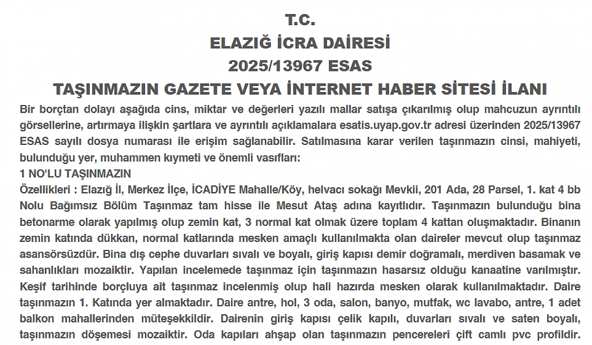 Elazığ’da icradan daire satışı Elazığlıların dikkatini çekti. Elazığ Merkez İcadiye Mahallesi’nde bulunan bir daire, borç nedeniyle icra yoluyla satışa çıkarıldı. Elazığ 1. İcra Dairesi tarafından yayımlanan ilana göre, söz konusu taşınmaz için elektronik ortamda açık artırma süreci başlatıldı.