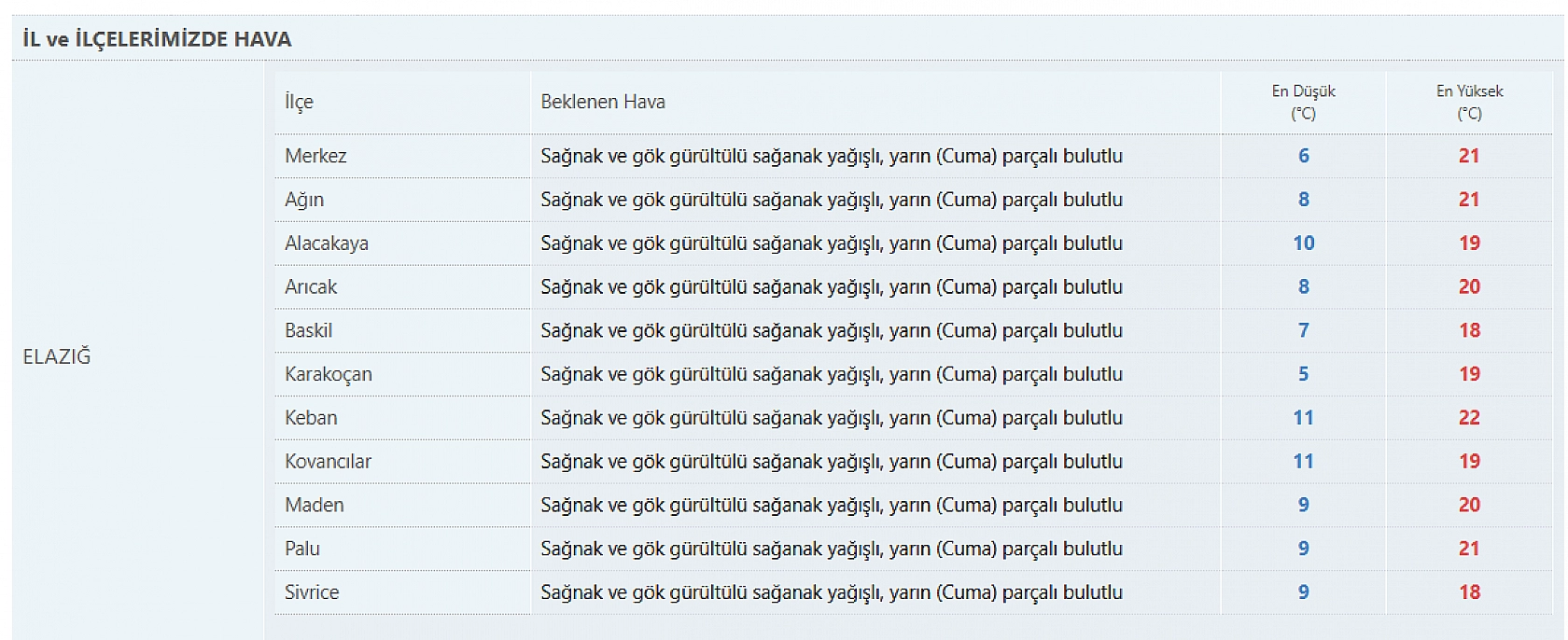 Meteoroloji 13. Bölge Müdürlüğü, Elazığ ve çevresinde sağanak ve gök gürültülü sağanak yağış beklendiğini, rüzgarın ise yer yer fırtına şeklinde eseceğini duyurdu. Vatandaşların çatı uçması, ağaç ve direk devrilmesi gibi olumsuzluklara karşı dikkatli olmaları istendi. İşte detaylar...
