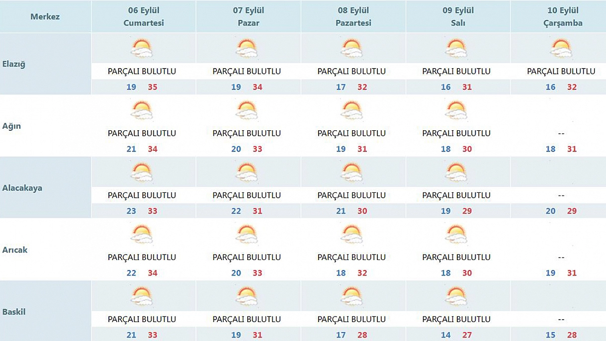 İşte Meteoroloji 13. Bölge Müdürlüğü'nün aktardığı verilere göre Elazığ'da 5 günlük hava durumu:
