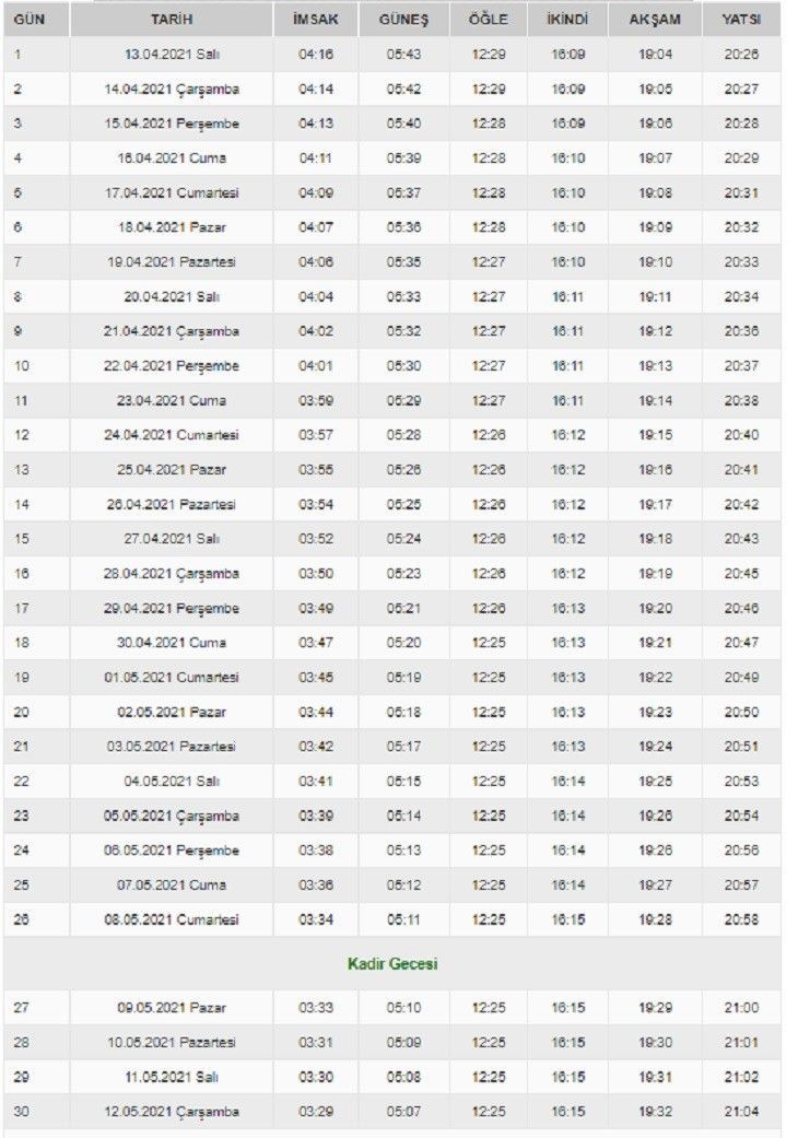 Diyanet İşleri Başkanlığı, illere göre 2021 yılı Ramazan imsakiyesini yayınladı.