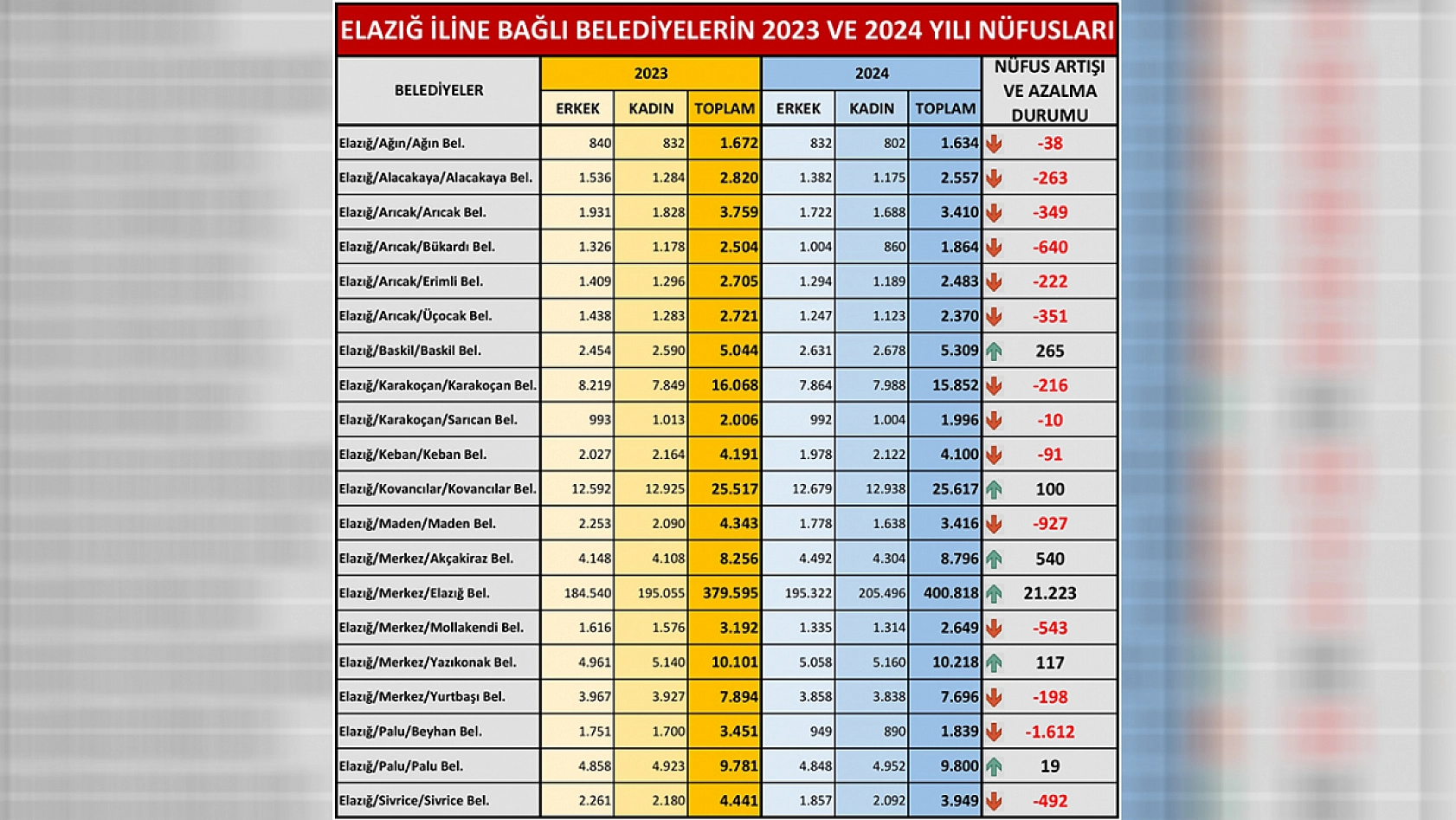 Türkiye İstatistik Kurumu (TÜİK) tarafından açıklanan 2024 yılı Adrese Dayalı Nüfus Kayıt Sistemi (ADNKS) sonuçlarına göre, Elazığ'da nüfus artışı 2023 yılına oranla en çok şehir merkezinde yaşandı.