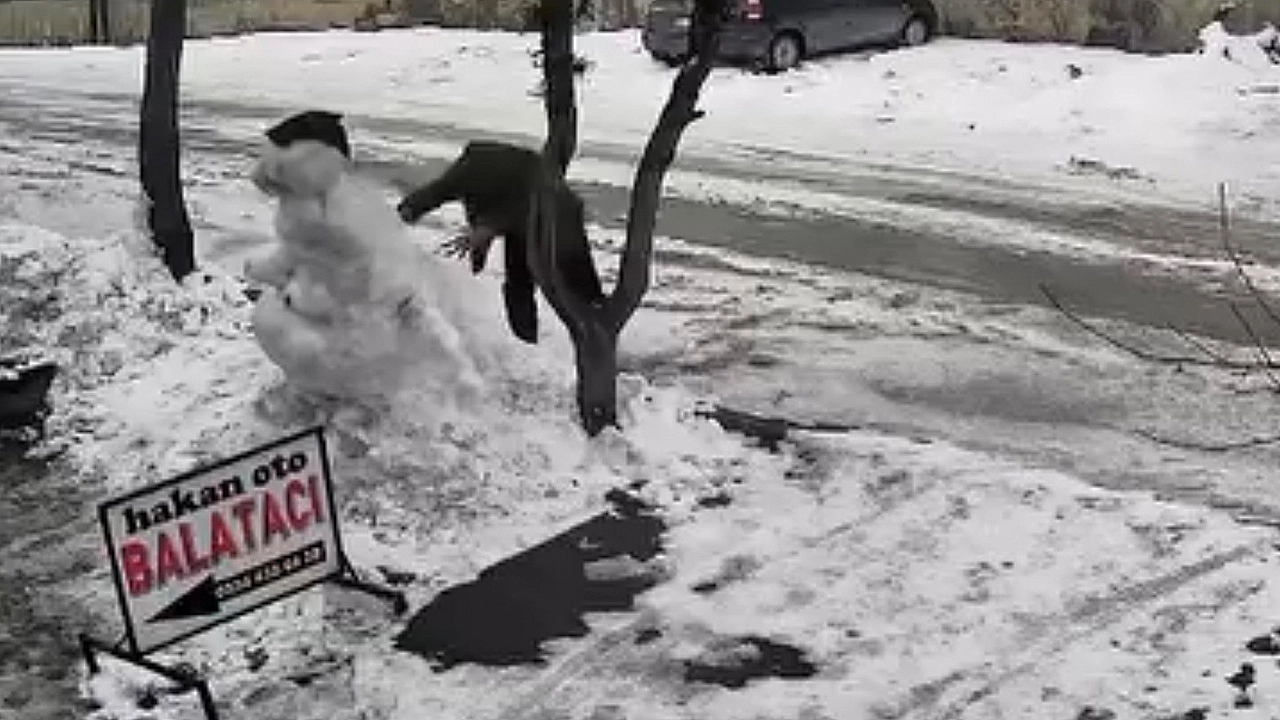 İlk görüntüde araçtan inen şahsın kardan adamı yıktıktan sonra tekrar aracına binip gittiği, ikinci görüntü de ise bir şahsın, kardan adama defalarca tekme attığı ve uzun uğraşlar sonucu yıkarak kaçtığı görüldü.