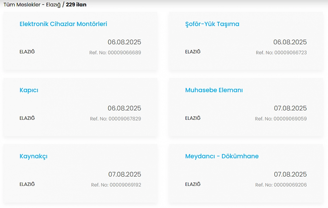 Türkiye İş Kurumu (İŞKUR), Elazığ için farklı sektörlerde yüzlerce iş ilanını güncelledi. Toplamda 229 açık iş ilanı bulunan kentte, hem nitelikli personel arayışları hem de genel işçi ihtiyaçları dikkat çekiyor. İşte Elazığ için açık iş ilanları…