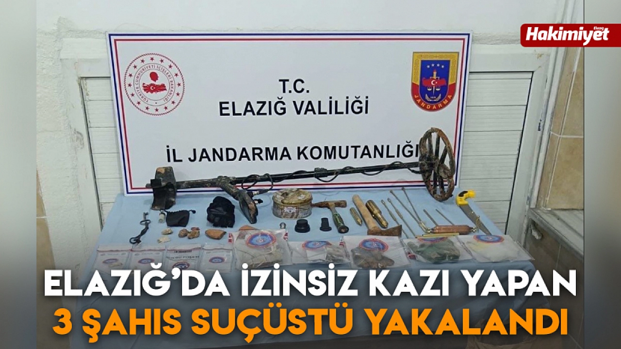 Elazığ'ın Ağın ilçesine bağlı Bademli köyünde jandarma ekiplerince izinsiz kazı yaptıkları tespit edilen 3 şahıs suçüstü yakalandı. Olay yerinde çok sayıda kazı malzemesi ele geçirilirken, şüpheliler hakkında adli tahkikat başlatıldı.