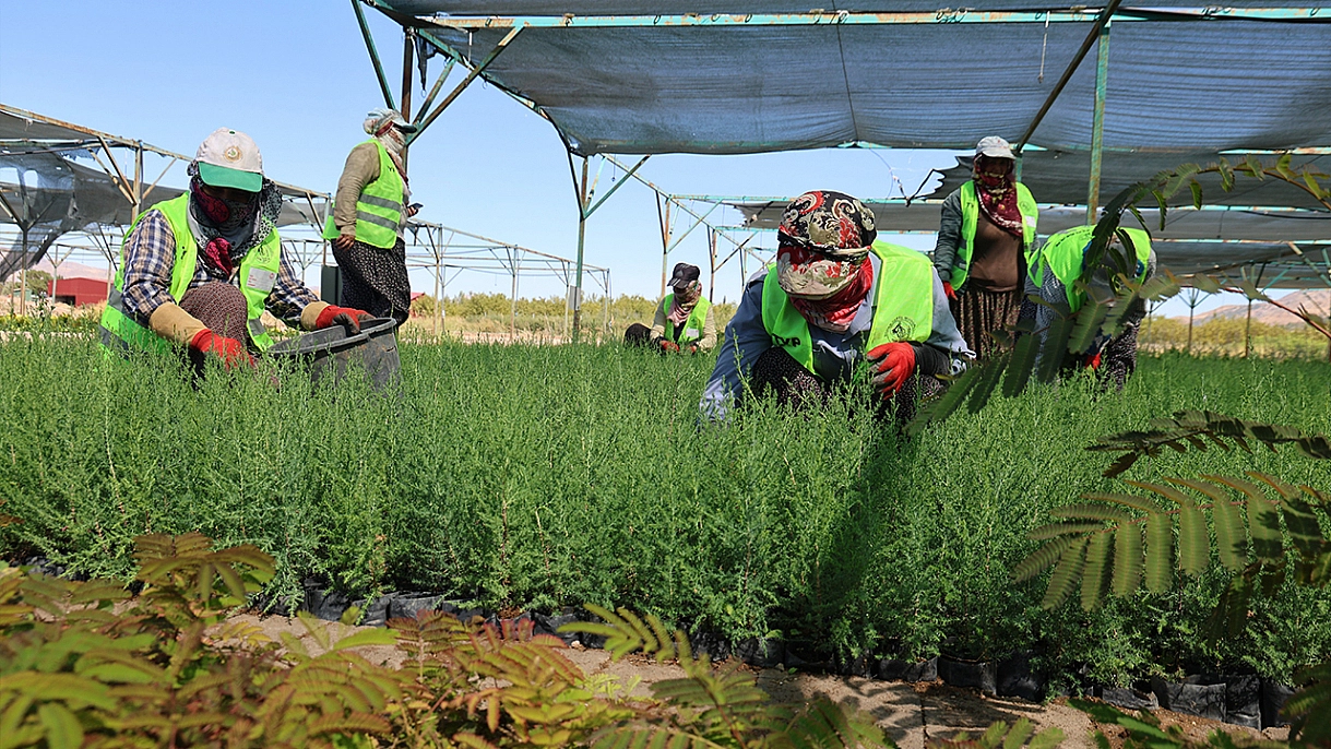 Elazığ Orman Bölge Müdürlüğü'ne bağlı Altınova Fidanlığı'nda yetiştirilen fidanlar, kadınlar tarafından büyük bir özenle büyütülerek yanan orman alanlarına gönderiliyor.