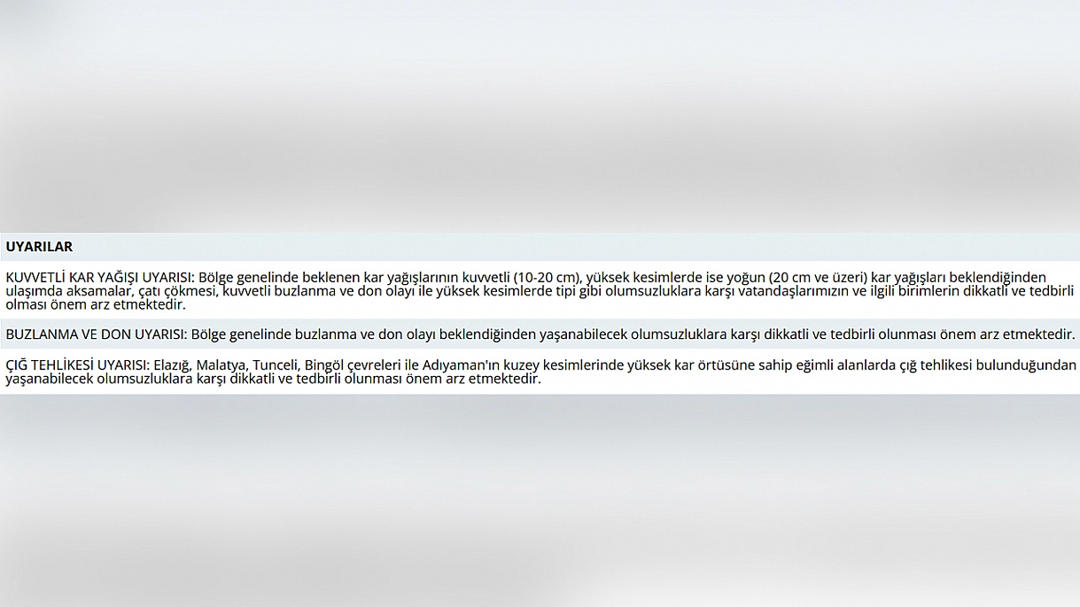 Haberler Yaşam Elazığ'da kar ve tehlike alarmı: Vatandaşlar dikkatli olmalı Elazığ'da kar ve tehlike alarmı: Vatandaşlar dikkatli olmalı Elazığ'da etkili olan yoğun kar yağışı nedeniyle Meteoroloji Genel Müdürlüğü, Elazığ ve çevre illere peş peşe uyarı geldi. PAYLAŞ 23.01.2026 11:49 Güncelleme: 23.01.2026 11:49 Ayşe ORZANMuhabir TAKİP ET 11 12 PAYLAŞ Görsel - 11 : Elazığ’da kar ve tehlike alarmı: Vatandaşlar dikkatli olmalı