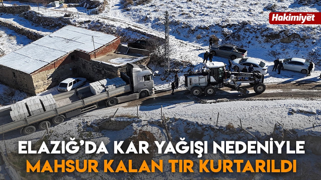 Elazığ'da kar yağışı nedeniyle yolda mahsur kalan tır, İl Özel İdaresi ekiplerinin greydere bağladığı halat yardımıyla kurtarıldı.