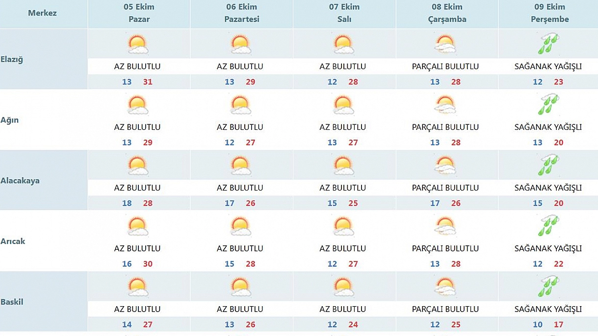 Oldukça kurak bir yaz döneminin ardından Eylül ayında da beklediği yağışları göremeyen Elazığ’da Meteoroloji 13. Bölge Müdürlüğü tarafından paylaşılan verilere göre hasret duyulan yağışlar geliyor. Elazığ ve tüm ilçelerde etkisini gösterecek yağışlar için 9 Ekim Perşembe günü işaret ediliyor. En düşük sıcaklıkların 12, en yüksek sıcaklığın 23 derece olarak hissedileceği tahmin edilen Perşembe günü Elazığ’da sağanak yağış bekleniyor. Vatandaşlar bu tarihte sel ve su baskınları için uyarılıyor.